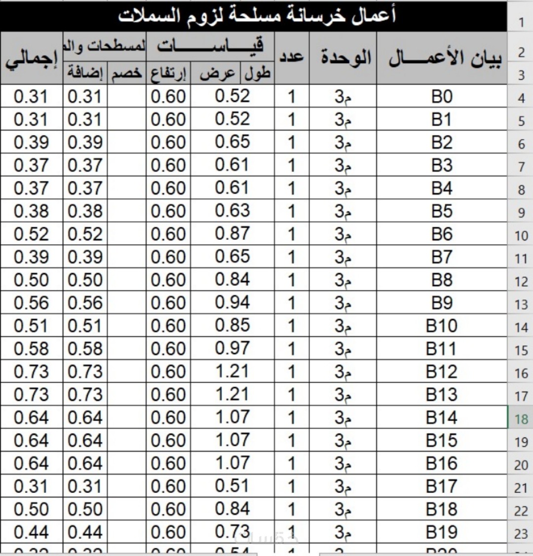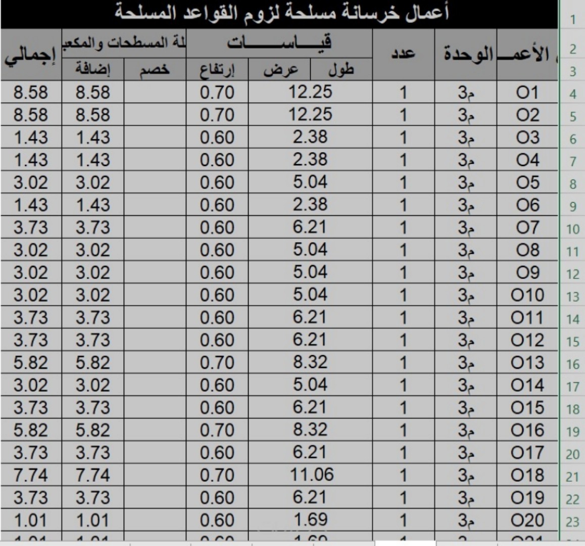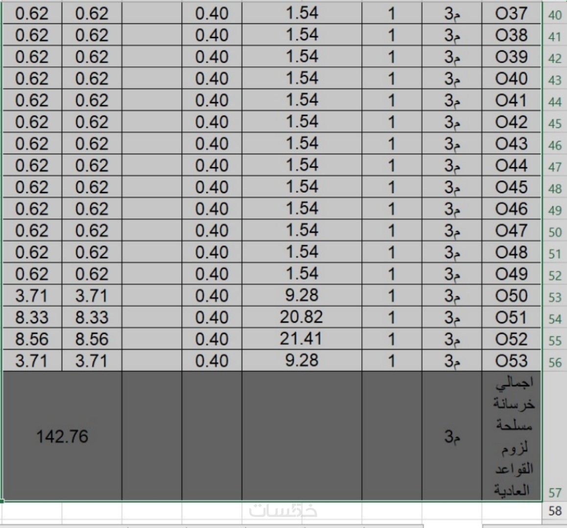 ملف Excel يحتوي على حصر كميات الأعمال الإنشائية والمعمارية بشكل منظم