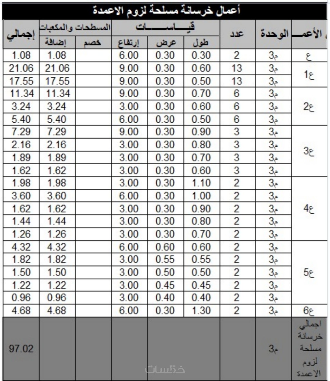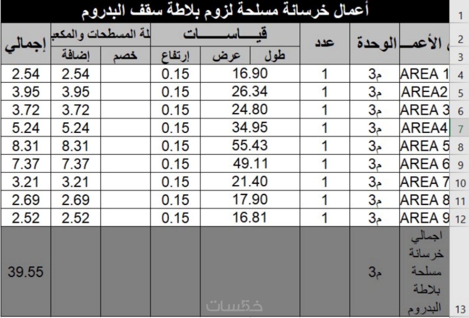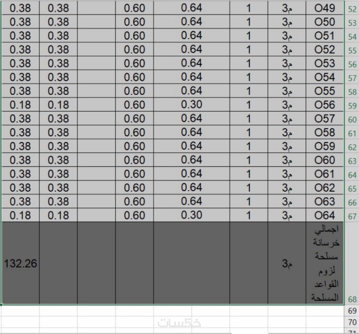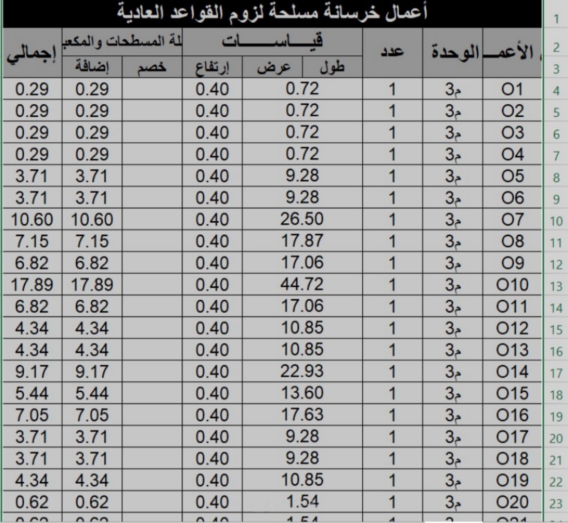 ملف Excel يحتوي على حصر كميات الأعمال الإنشائية والمعمارية بشكل منظم