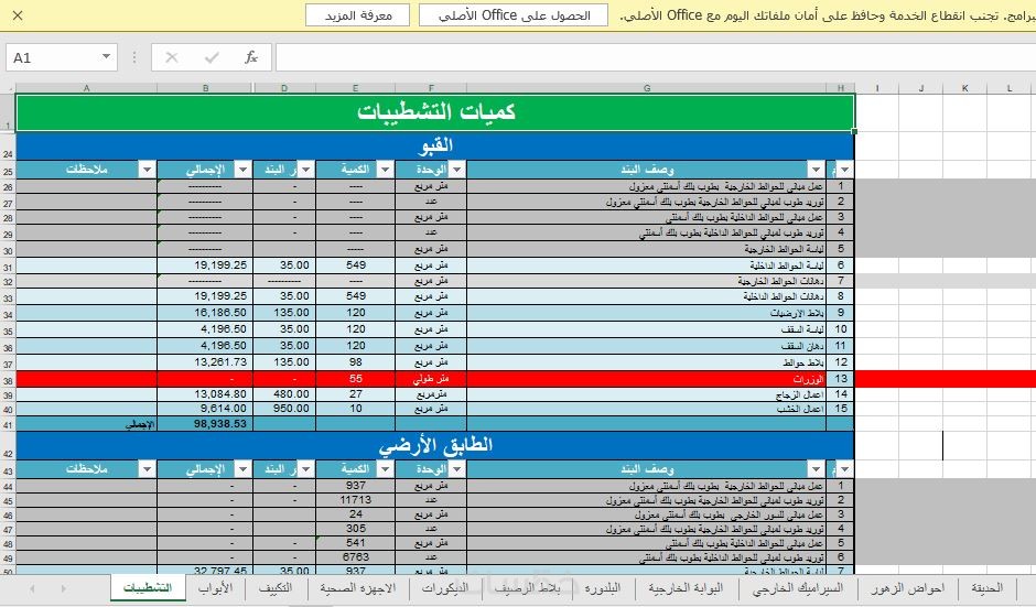 ملف pdf احترافي جاهز للاستخدام يحتوي على حصر كميات تفصيلي لبنود مثل: أعمال اللياسة أعمال الجبس والأسقف
