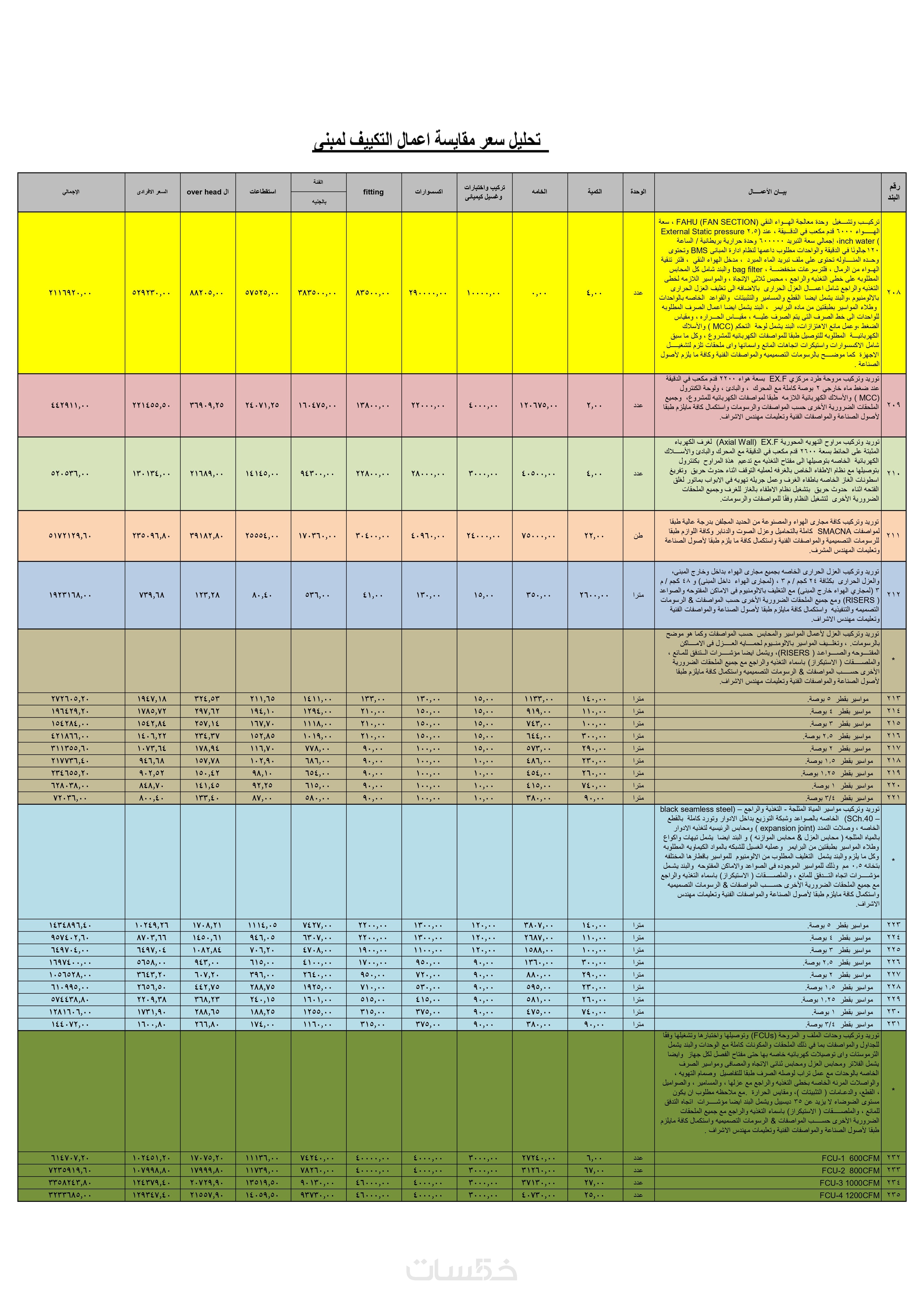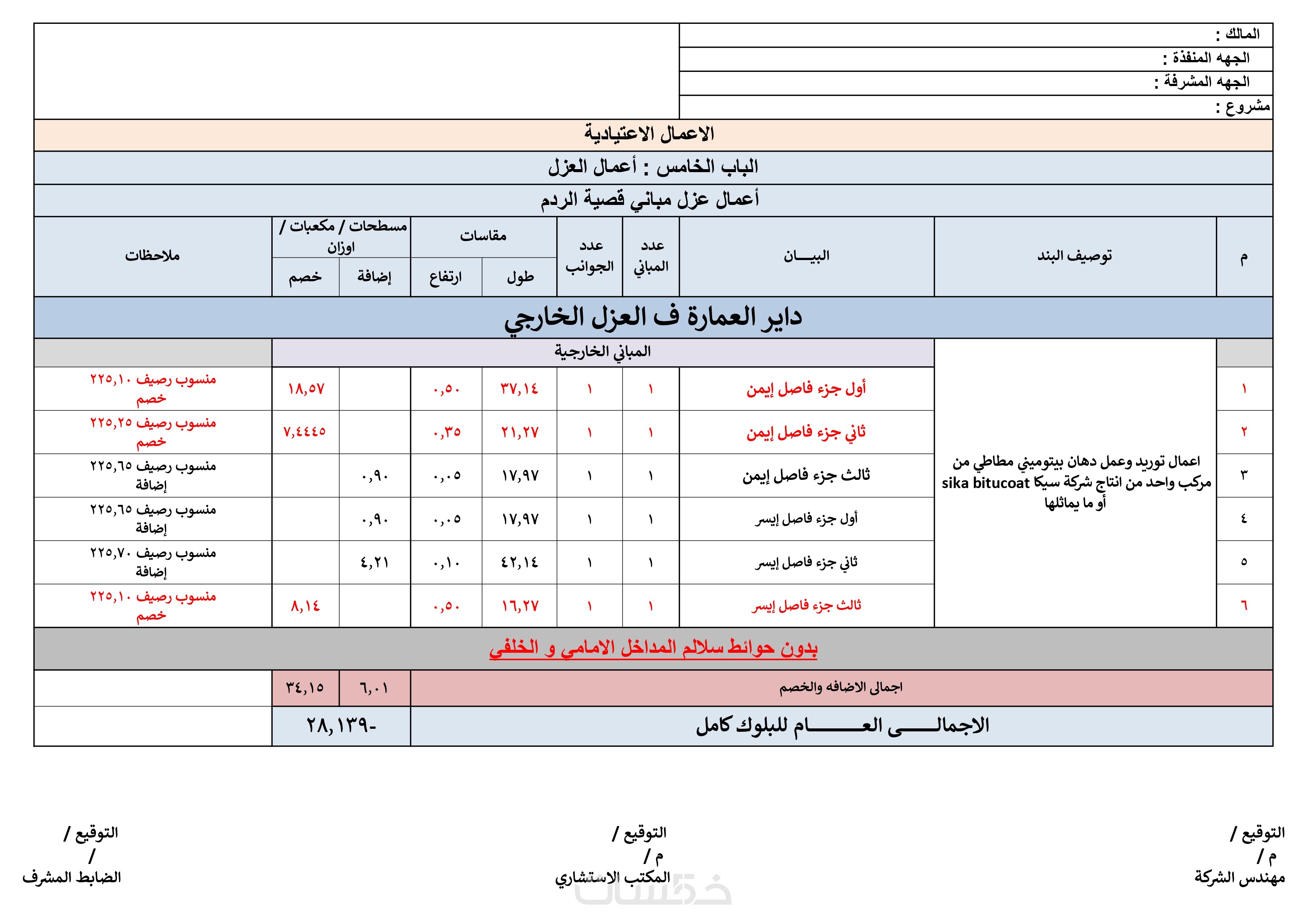 * تعتبر جميع الأعمال تحت الأرضية (من حفر وردم وإحلال وعزل وجميع حسابات الأساسات والقواعد والرقاب والميدات) تمثل مسطح دور واحد في تقدير التكلفة ويقاس باعتماد الحدود الخارجية للمبنى ككل.