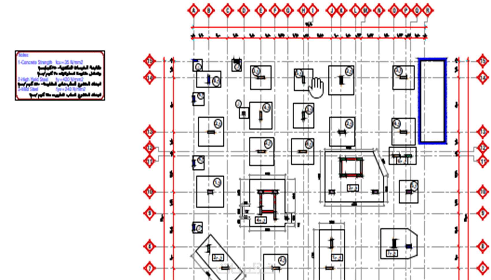 1- مخطط محاور الأعمدة وجدول تسليح الاعمده