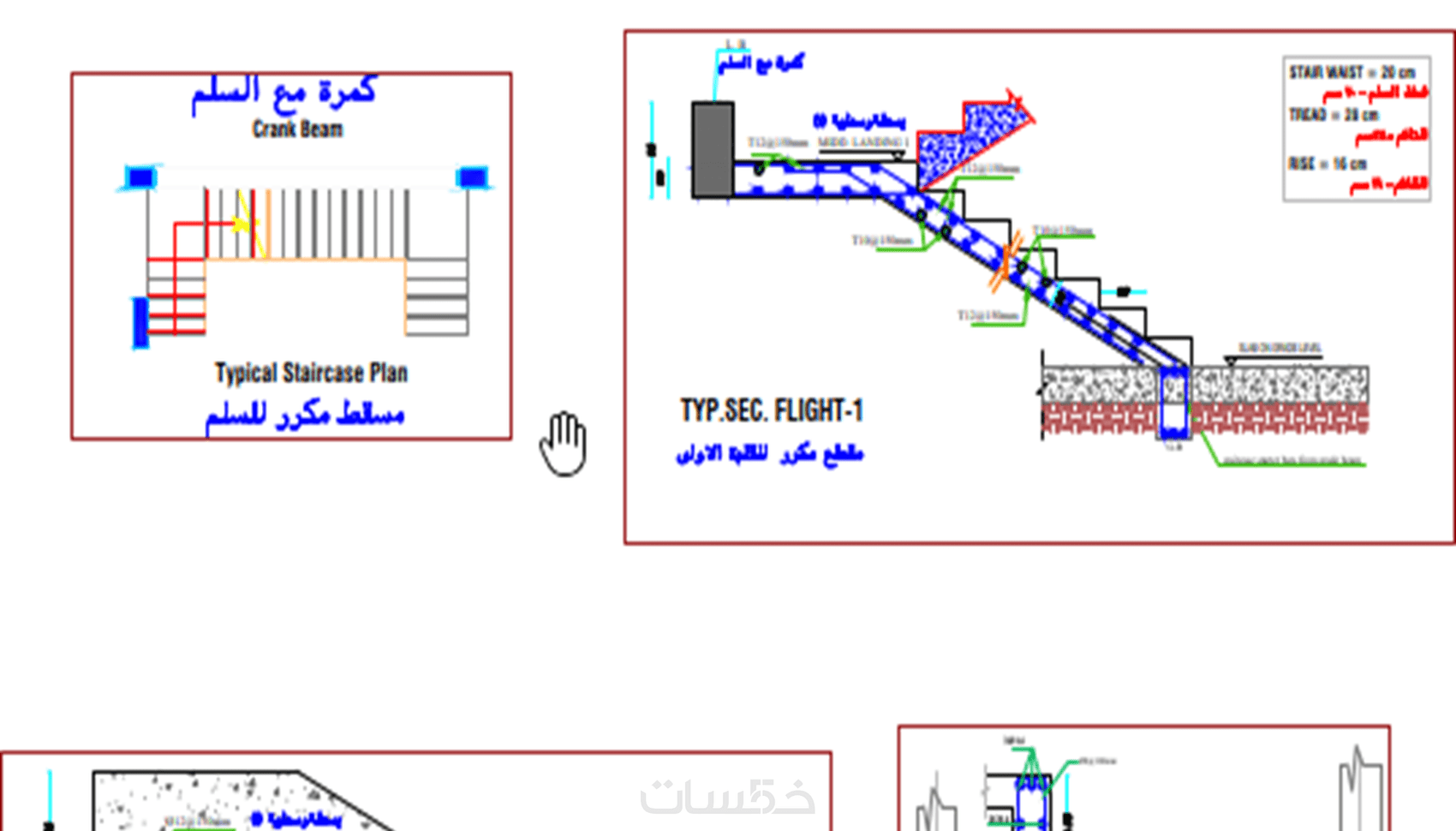 5- مخططات أخرى تحتوي على تفاصيل للدرج والقواعد والاعمده والبير والسابتك وأي جزء يحتاج لتوضيح خلال التصميم وأي أجزاء أخرى يحتاجها اليها في عمليه التنفيذ
