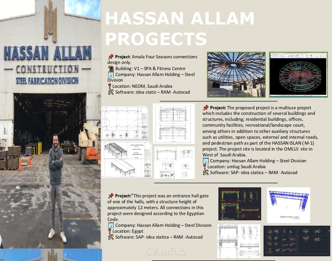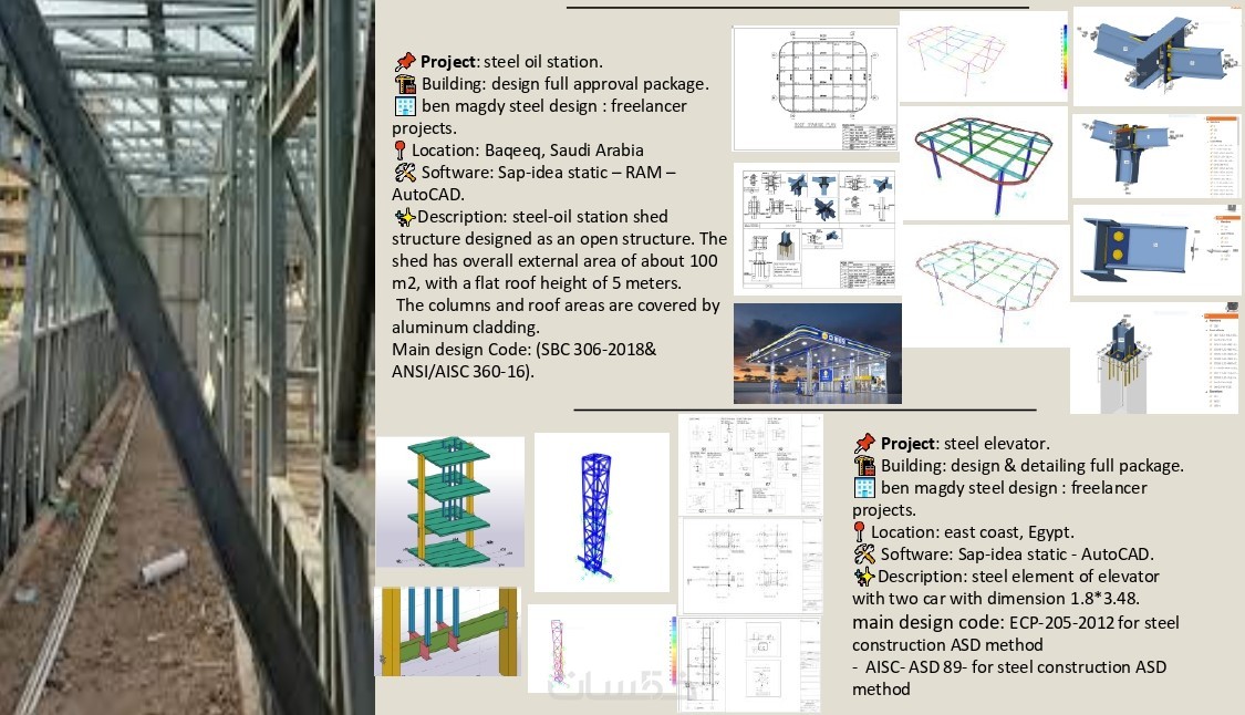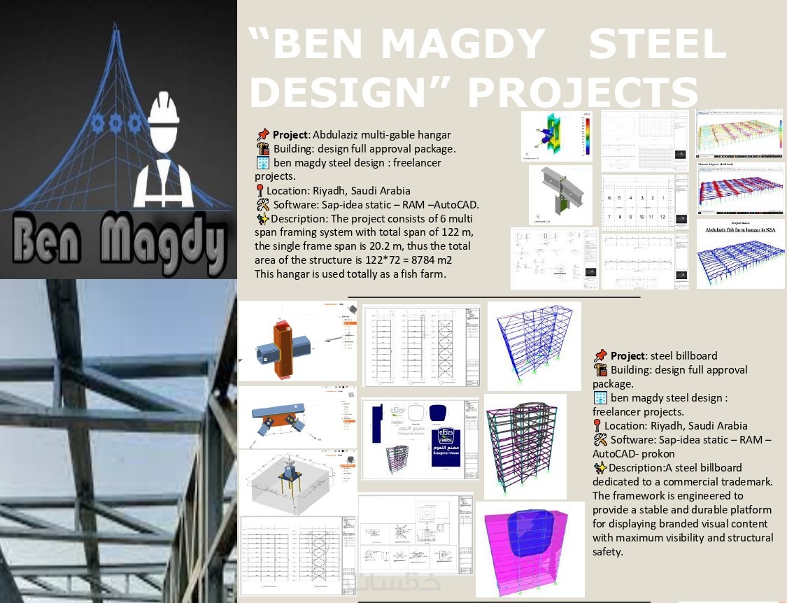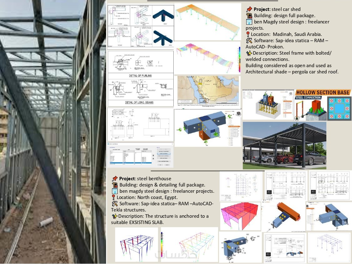 • نمذجة وتحليل المنشآت المعدنية steel structures (المباني الصناعية ومتعددة الطوابق، الحظائر، الشيدات، التراسات، الممرات، الهناجر ،الأعمدة المعدنية إلخ.) باستخدام برنامج sap, staad pro