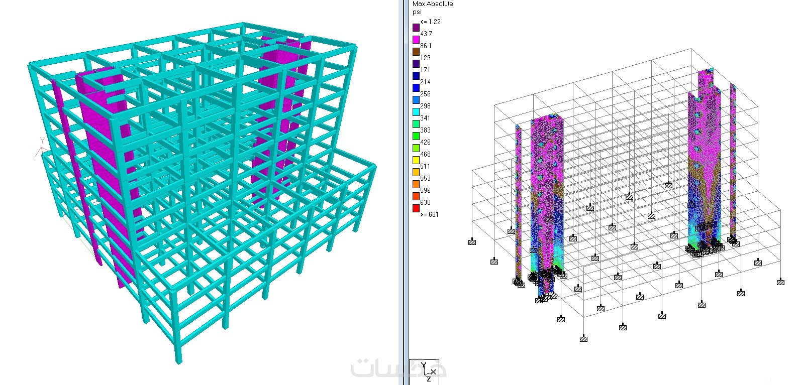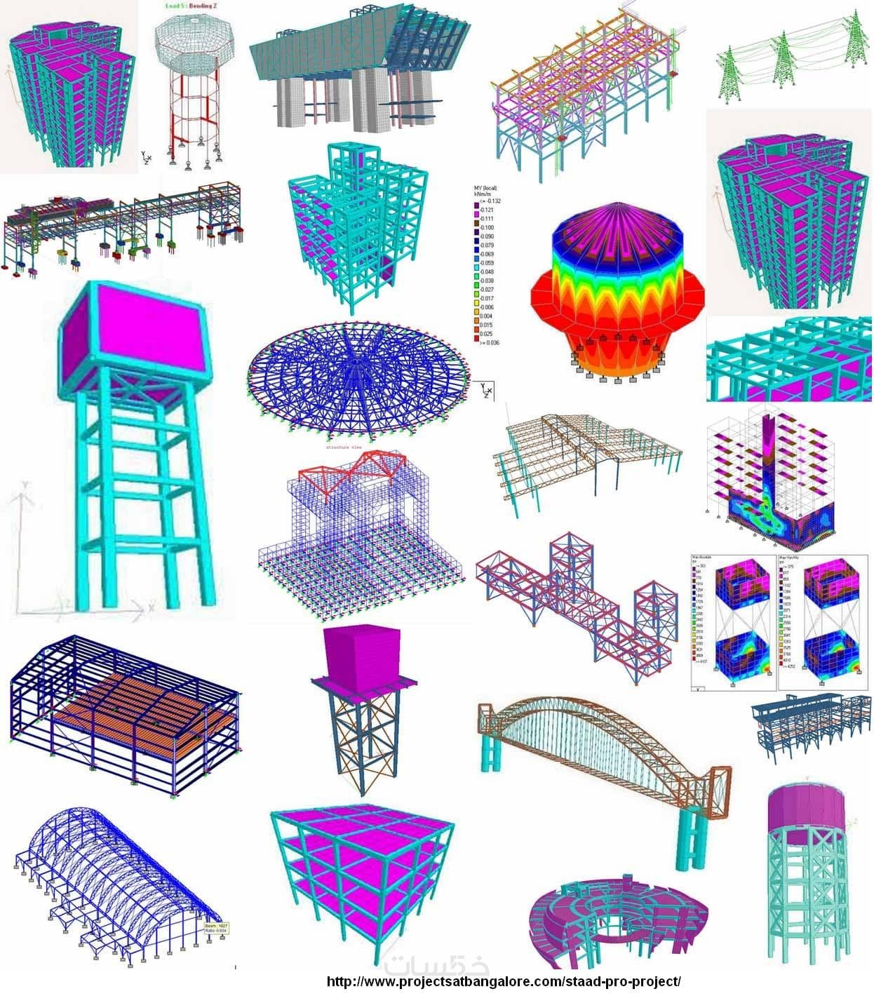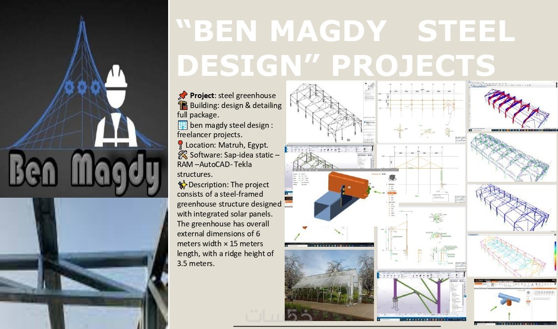 • نمذجة وتحليل المنشآت المعدنية steel structures (المباني الصناعية ومتعددة الطوابق، الحظائر، الشيدات، التراسات، الممرات، الهناجر ،الأعمدة المعدنية إلخ.) باستخدام برنامج sap, staad pro