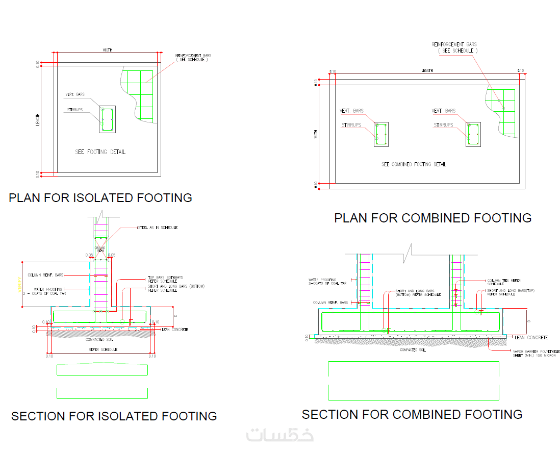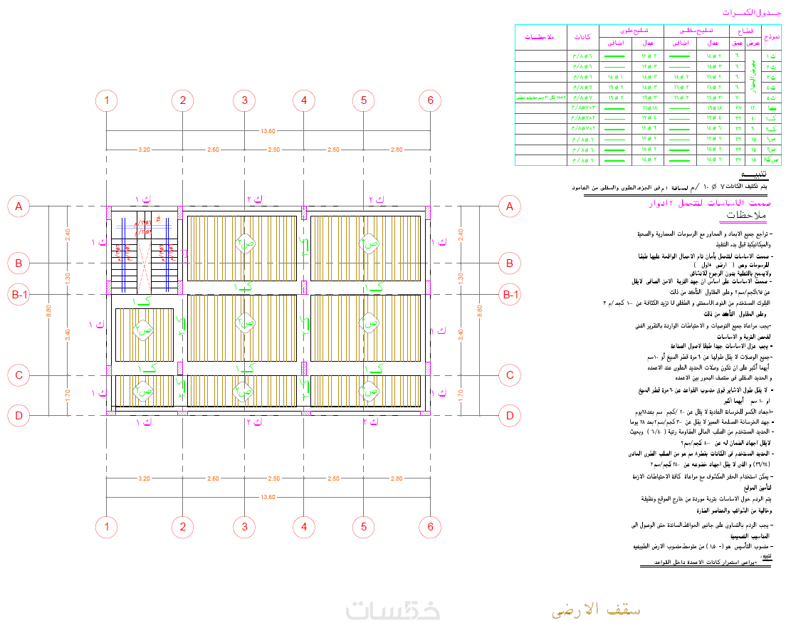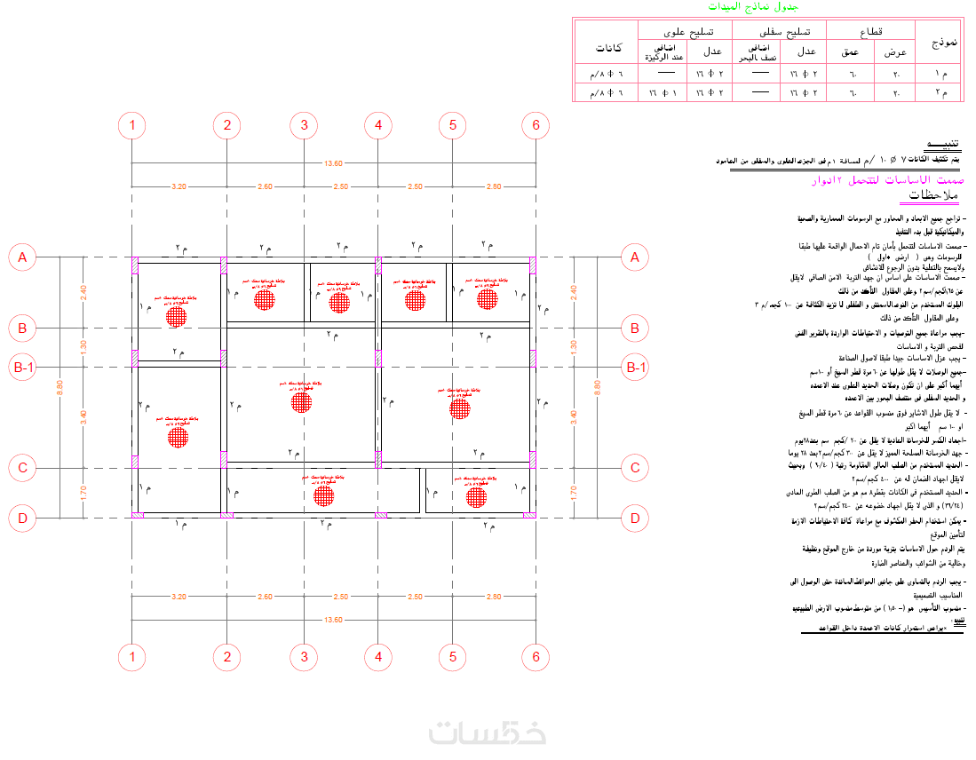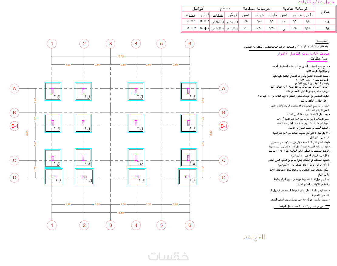 1- مخطط الأساسات مع جدول تسليح الأساسات