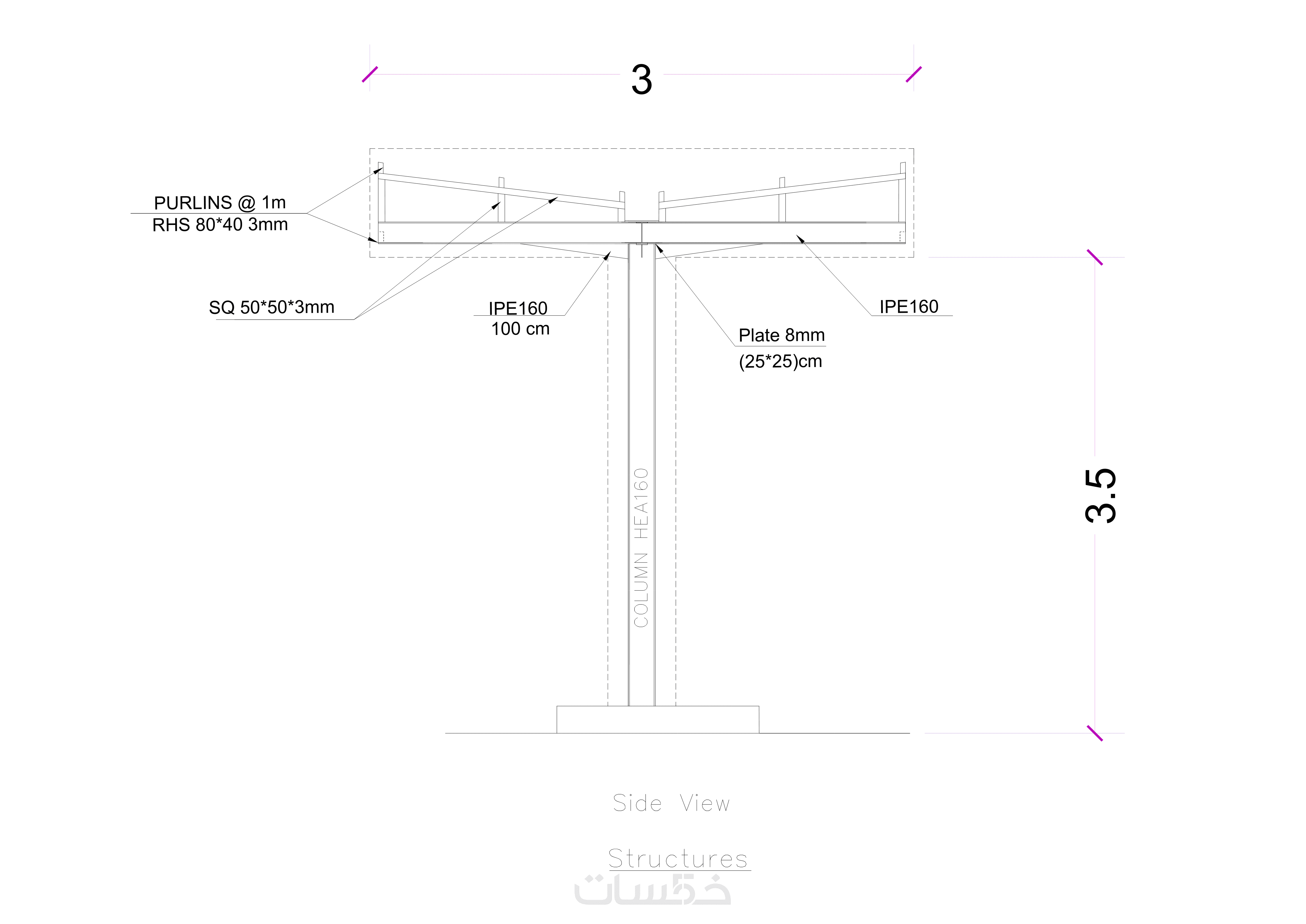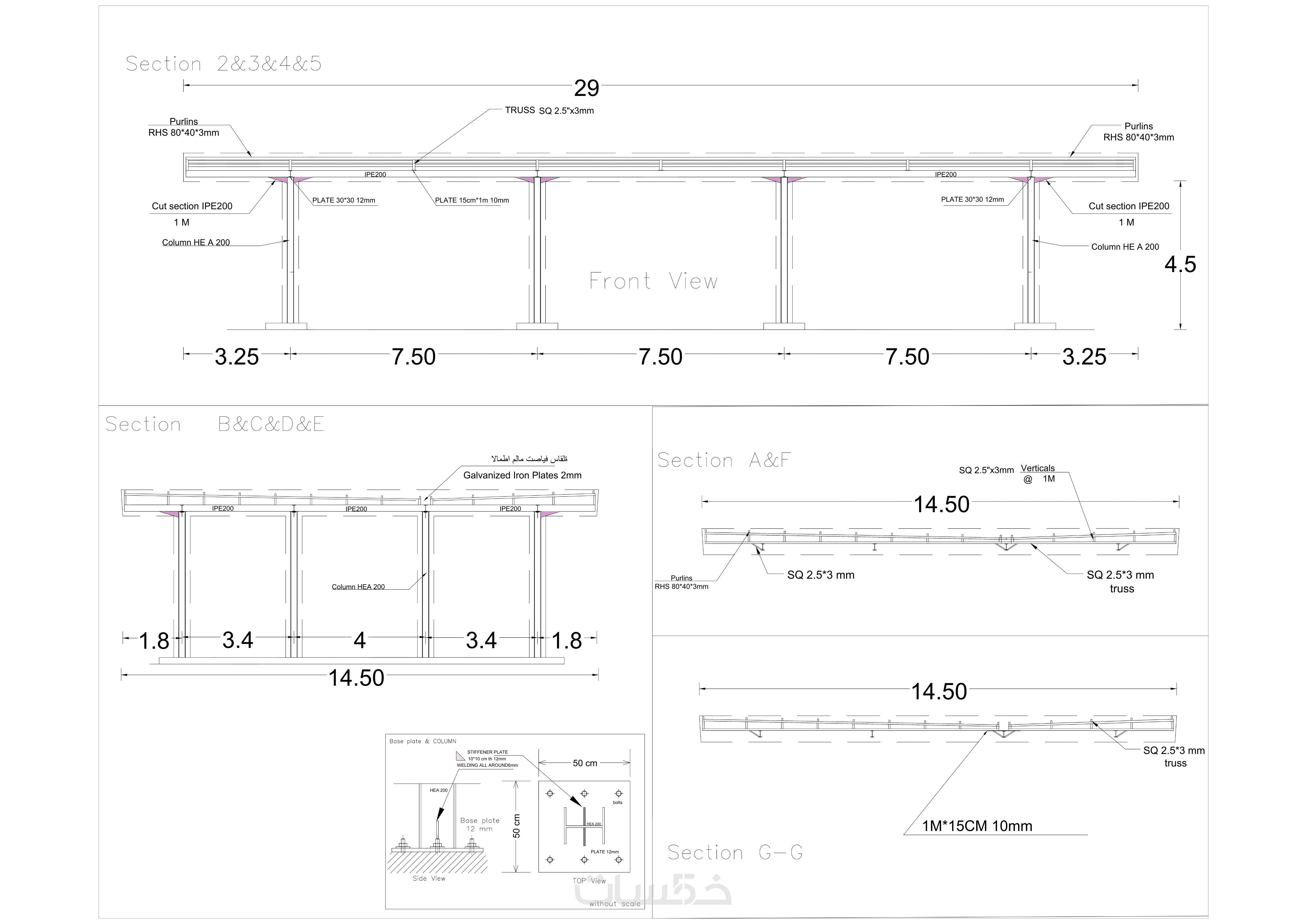 - رسم مخطط إنشائي لمنشأ حديدي بسيط بمساحة 50 م² لدور واحد فقط، مقابل قيمة الخدمة الأساسية.