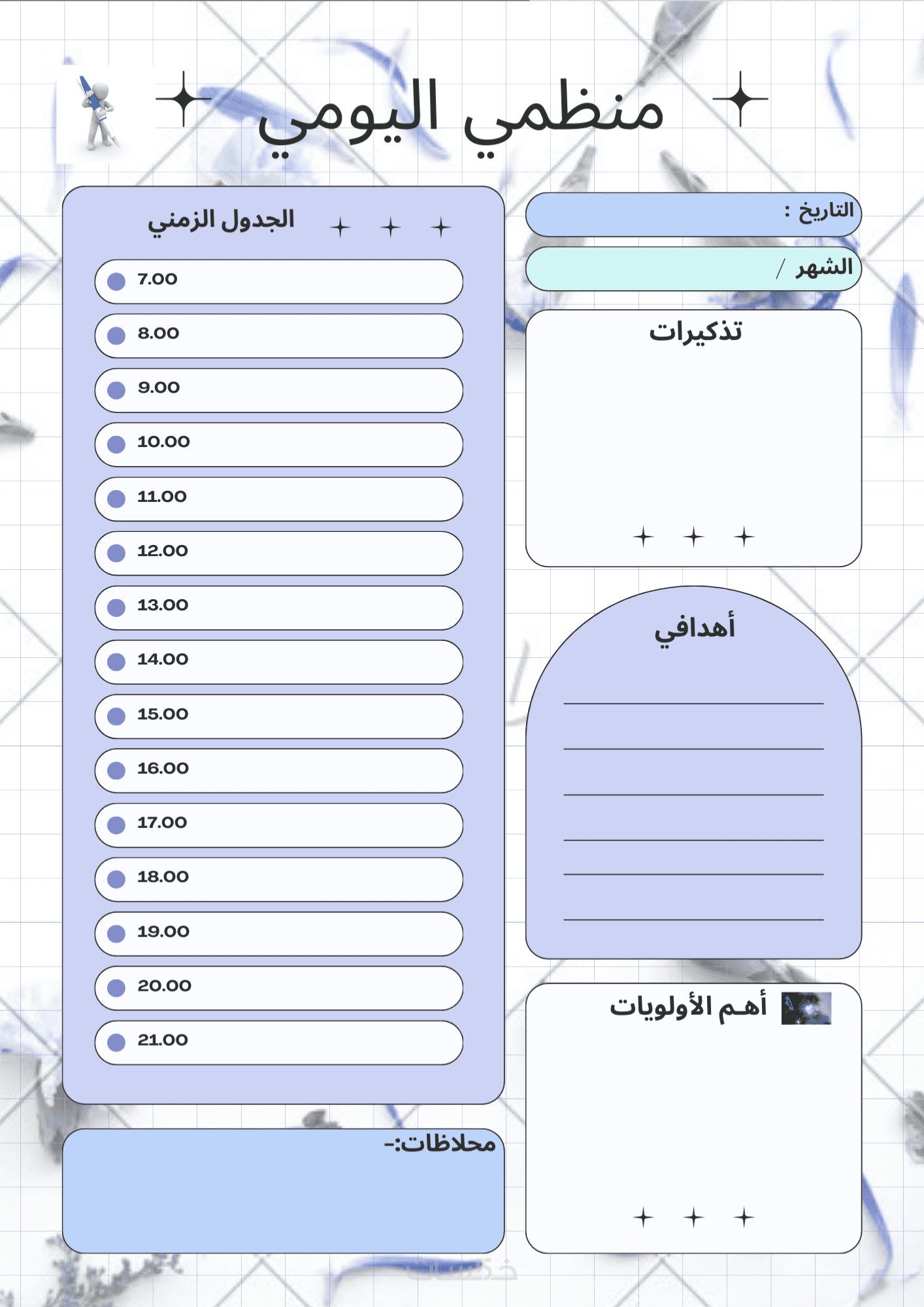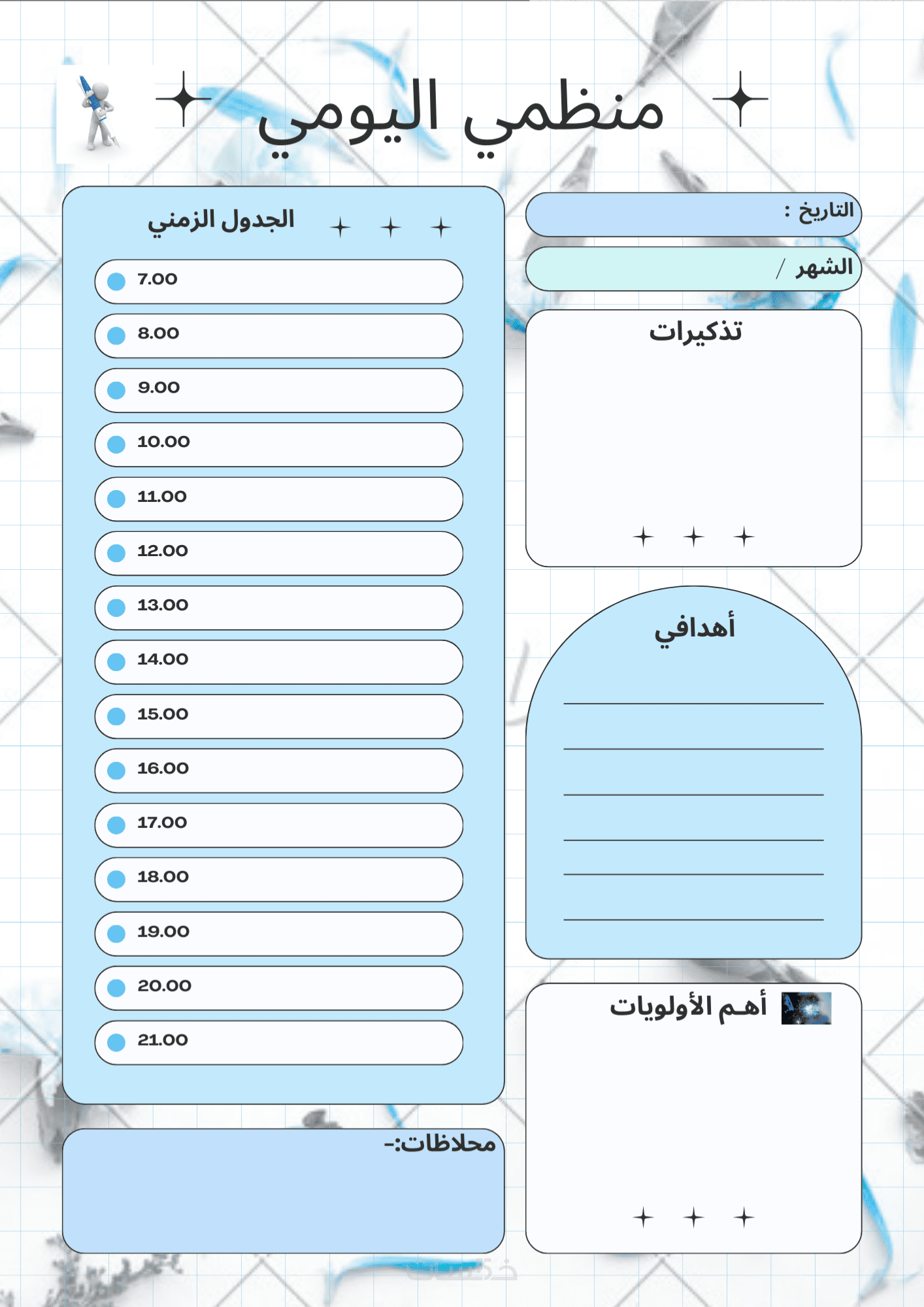 ملف منظم بصيغة PDF أو صورة عالية الجودة، يحتوي على تقسيم زمني لساعات يومك، قائمة بالمهام ذات الأولوية، ومساحة لمتابعة العادات اليومية.".