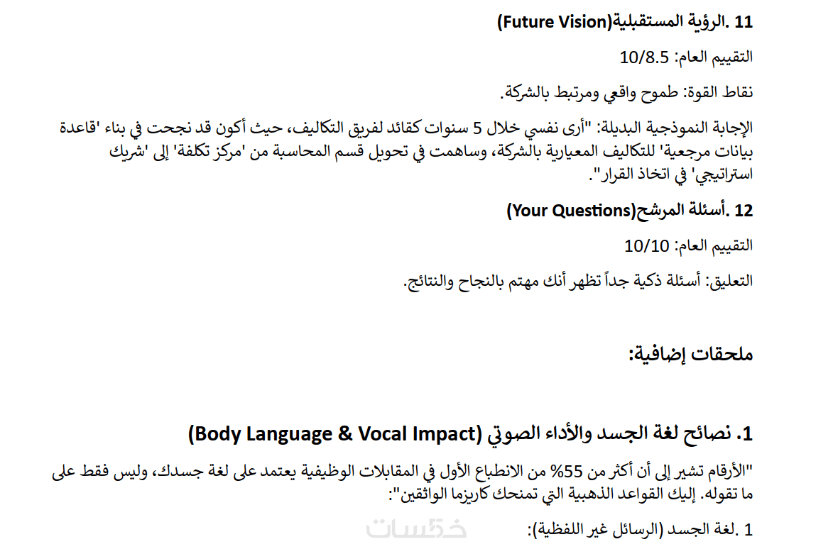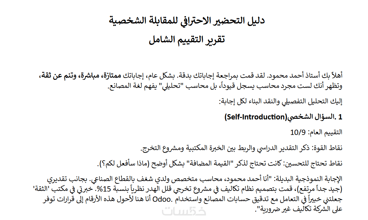 ( الخدمة الأساسية تمنحك الدليل الشامل لتتدرب عليه بنفسك. إذا أردت أن أختبرك، بحيث ترسل لي إجاباتك مكتوبة أو مسجلة صوتيا، وأقوم بتحليل إجاباتك وإرسال "تقرير تقييم شامل" يوضح نقاط قوتك، والأخطاء التي وقعت بها، مع إعادة صياغة إجاباتك الضعيفة لتصبح مثالية ومقنعة لمدير التوظيف.، يرجى الاطلاع على التطويرات).