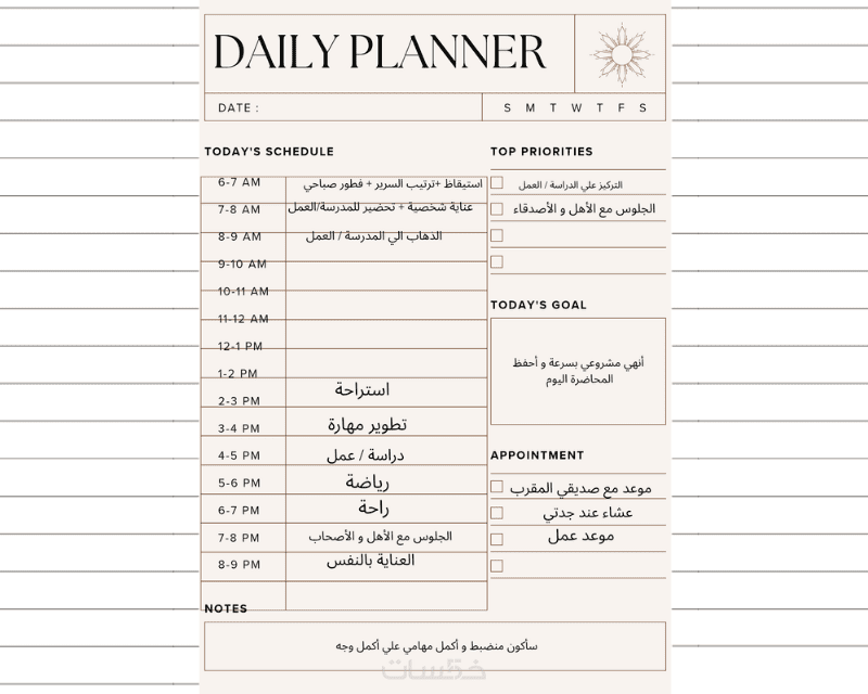 بسيط وواضح ، لا يضغطك بمهامك اليومية ، يمكن إتباعه بسهولة كل يوم، مناسب لوقتك الحقيقي ، يحتوي علي وقت للراحة ايضا.