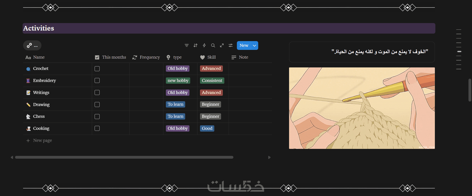 بعد ثلاث سنوات من الخبرة في notion أستطيع تنفيذ template شخصي مناسب لحياتك اليومية وهواياتك ومشاكلك الشخصية والعادات التي تحاول أن تبنيها في حياتك، بداية من قالب بسيط تفاعلي لمتابعة المهام اليومية والعادات الروتينية، وحتى تخصيصه بشكل كامل بما يناسب حياتك الشخصية ليكون خاصًا بك ومناسبًا تمامًا لمتطلباتك الشخصية، حسب اختيارك لمميزات الخدمة والتطويرات المتاحة لها.