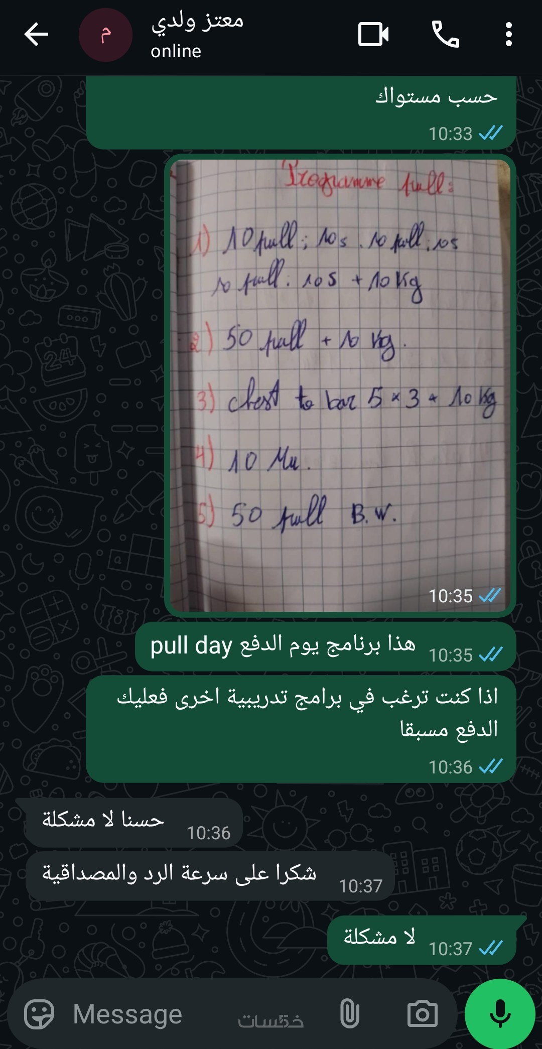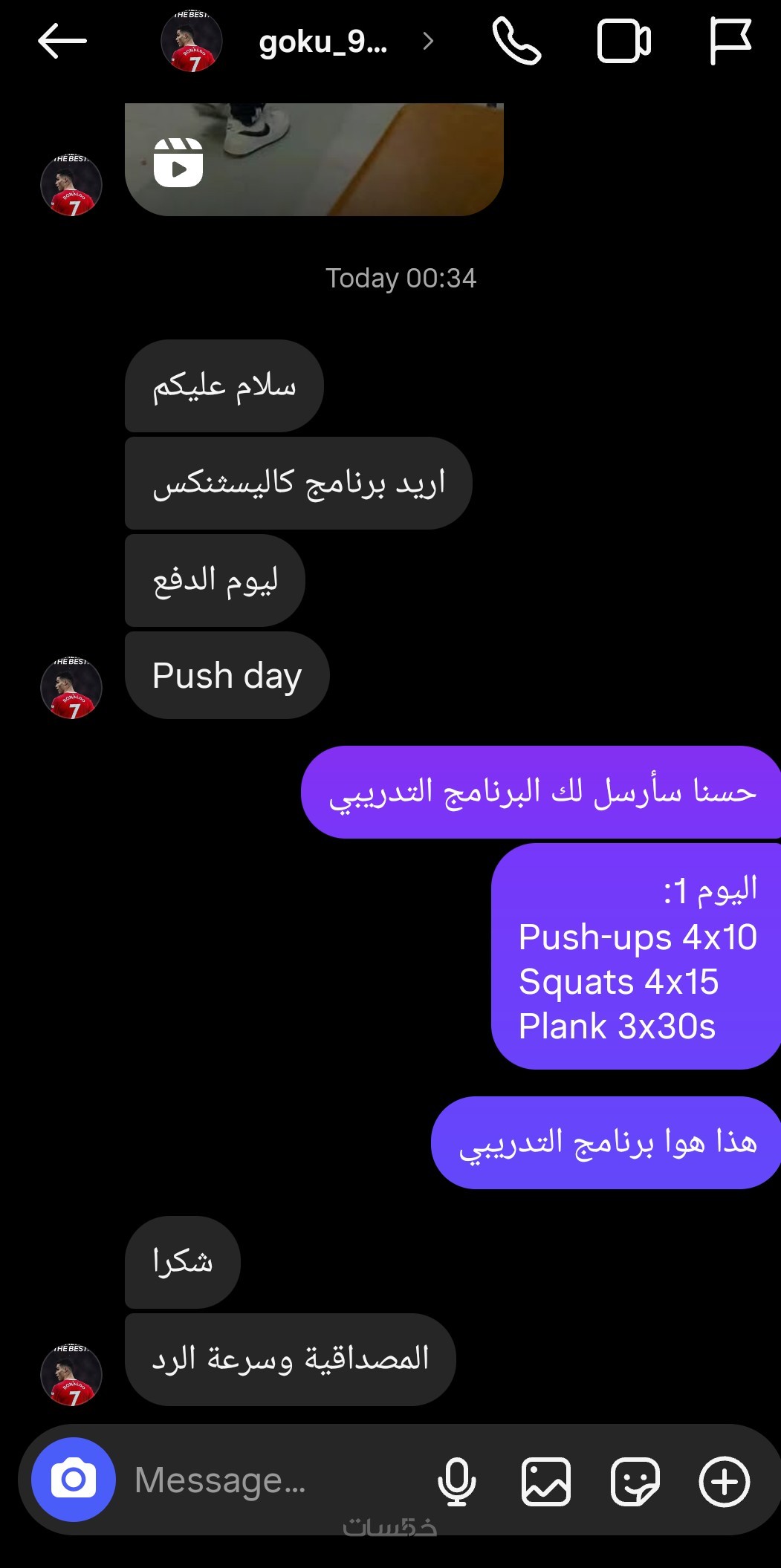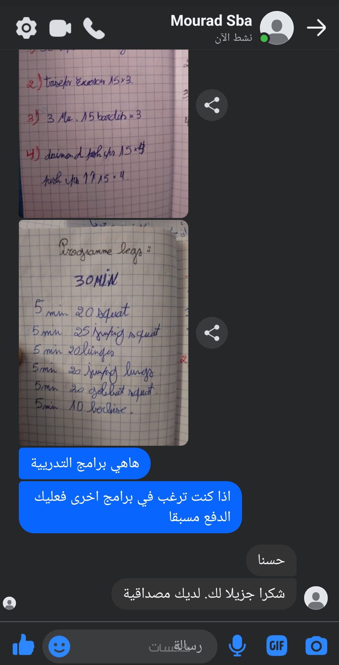 بعد طلب الخدمة، سأطلب منك بعض المعلومات البسيطة (العمر، الطول، الوزن، المستوى) لأجهّز لك البرنامج الأنسب.