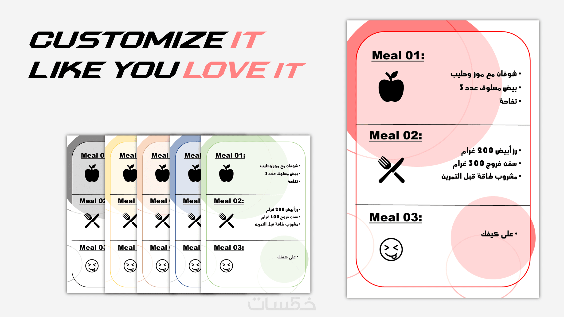سأجعل كل ملف مُشبع بشخصيتك كـ مُدرّب، من خلال دمج شعارك الخاص وتنسيق الألوان بما يتوافق مع حساباتك على السوشيال ميديا.