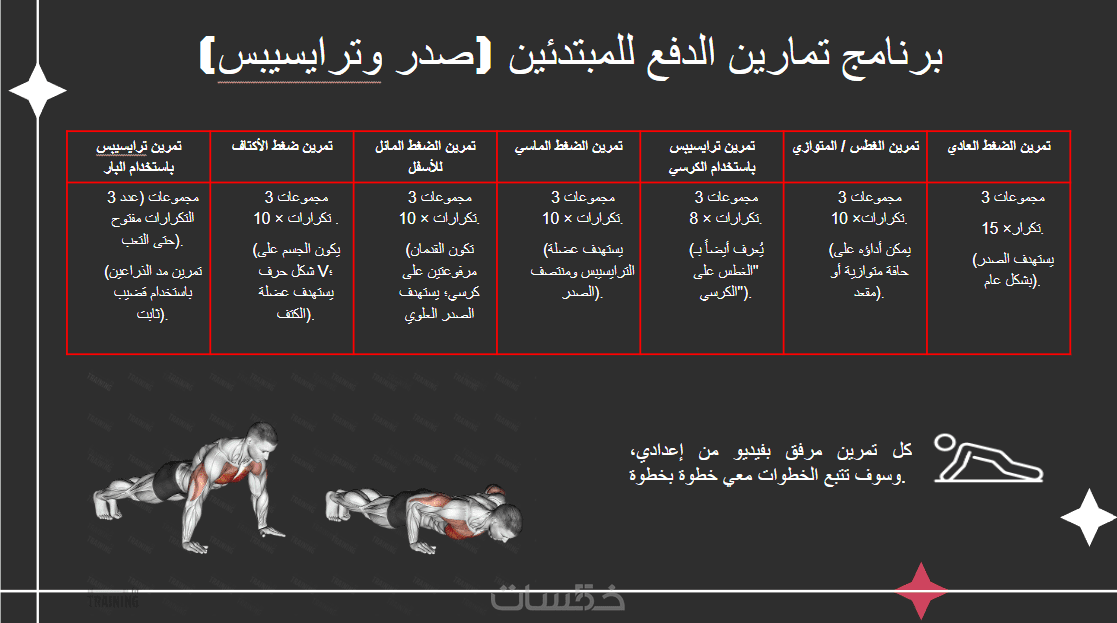+محتوى الجلسة: شرح مفصل لكل تمرين (مثل الضغط، الغطس، والعقلة...) مع فيديوهات توضيحية من إعدادي الخاص لضمان الأداء الصحيح.