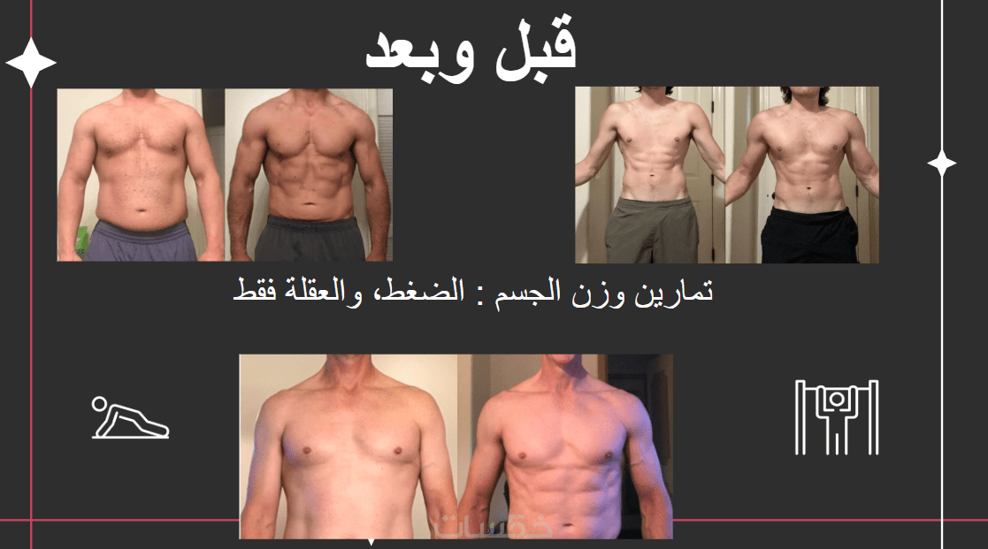 بناء كتلة عضلية متناسقة: الوصول إلى جسم رياضي منحوت وتفاصيل عضلية واضحة باستخدام "تمارين المقاومة بوزن الجسم" فقط، ودون الحاجة لأوزان ثقيلة.