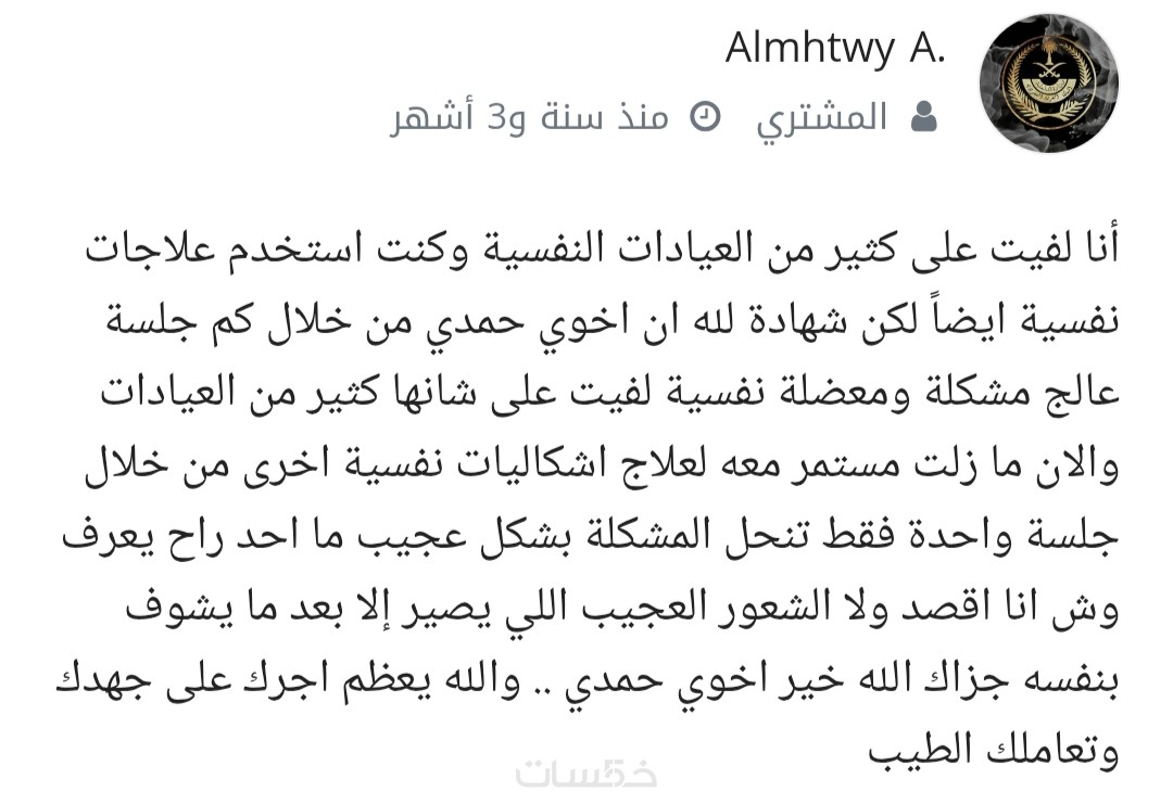 أنا لفيت على كثير من العيادات النفسية وكنت استخدم علاجات نفسية ايضاً لكن شهادة لله ان اخوي حمدي من خلال كم جلسة عالج مشكلة ومعضلة نفسية لفيت على شانها كثير من العيادات والان ما زلت مستمر معه لعلاج اشكاليات نفسية اخرى من خلال جلسة واحدة فقط تنحل المشكلة بشكل عجيب ما احد راح يعرف وش انا اقصد ولا الشعور العجيب اللي يصير إلا بعد ما يشوف بنفسه جزاك الله خير اخوي حمدي .. والله يعظم اجرك على جهدك وتعاملك الطيب