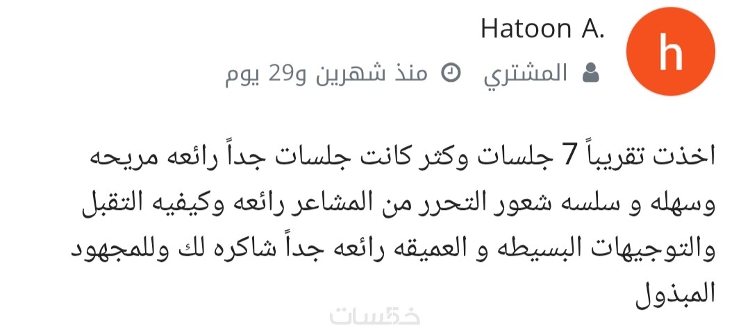 اخذت تقريباً 7 جلسات وكثر كانت جلسات جداً رائعه مريحه وسهله و سلسه شعور التحرر من المشاعر رائعه وكيفيه التقبل والتوجيهات البسيطه و العميقه رائعه جداً شاكره لك وللمجهود المبذول