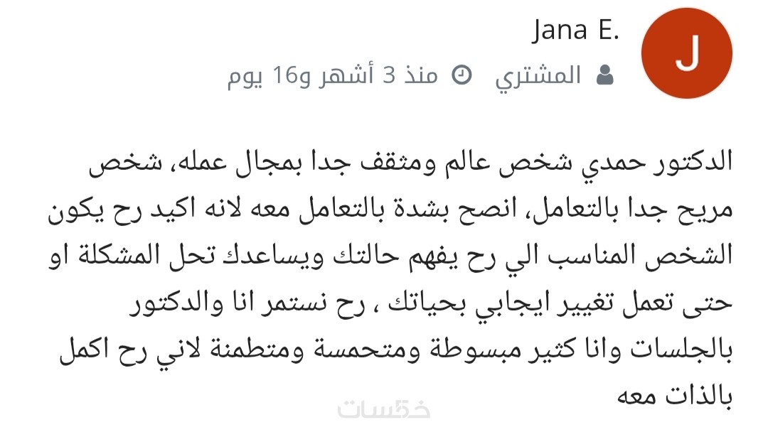 الدكتور حمدي شخص عالم ومثقف جدا بمجال عمله، شخص مريح جدا بالتعامل، انصح بشدة بالتعامل معه لانه اكيد رح يكون الشخص المناسب الي رح يفهم حالتك ويساعدك تحل المشكلة او حتى تعمل تغيير ايجابي بحياتك ، رح نستمر انا والدكتور بالجلسات وانا كثير مبسوطة ومتحمسة ومتطمنة لاني رح اكمل بالذات معه