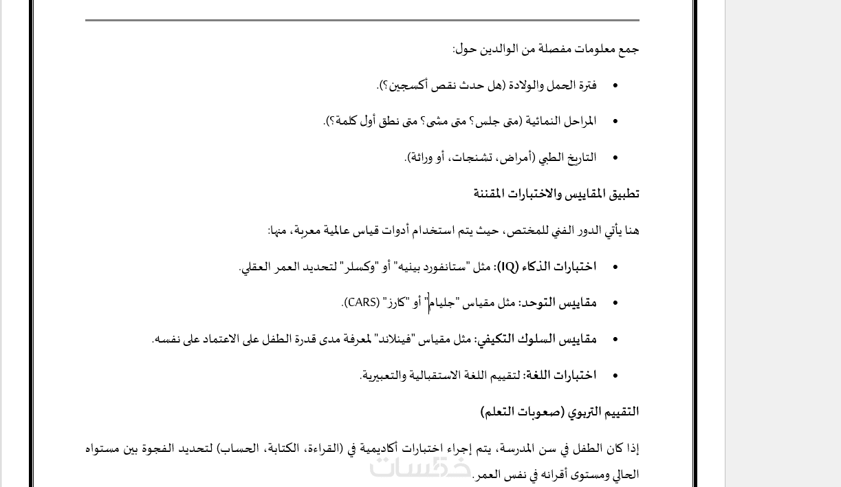 أجمع في خدمتي بين الفهم العميق للاضطرابات النمائية وبين مهارة صياغة الخطط والبرامج بأسلوب أكاديمي احترافي.