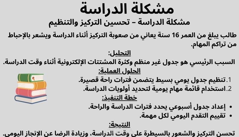 هل تواجه صعوبة في اتخاذ قرار يخص دراستك، وقتك، أو علاقاتك؟ أقدم لك خدمة تحليل وتوجيه عملي للمراهقين لمساعدتك على فهم مشكلتك والوصول لحلول منطقية خطوة بخطوة، بعيداً عن التعقيد.