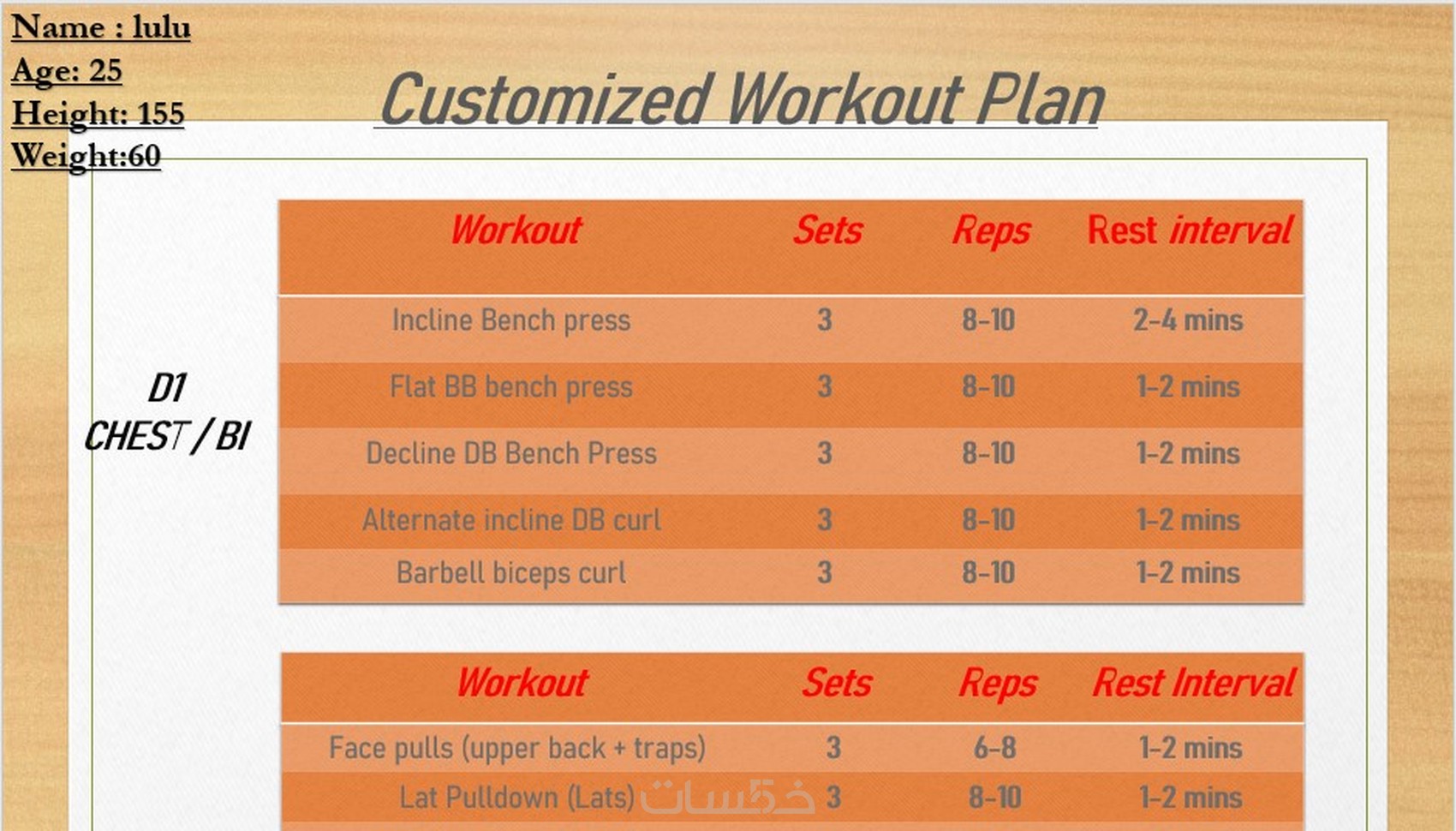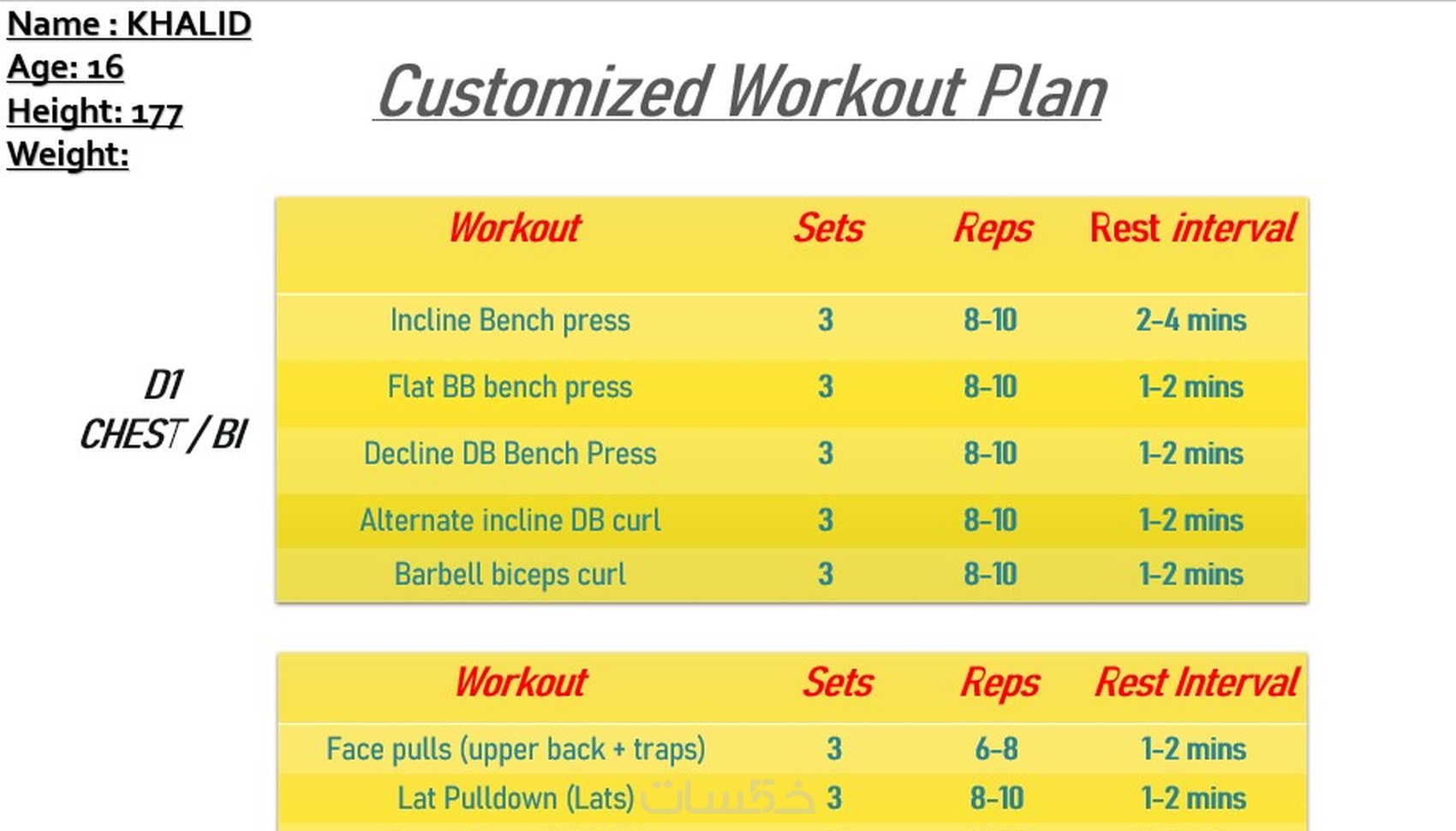 تستلم جدول تمارين حسب هدفك خصيصاً و (باللغة الانجليزية) وهذا لتسهيل البحث عن التمرين باليوتيوب