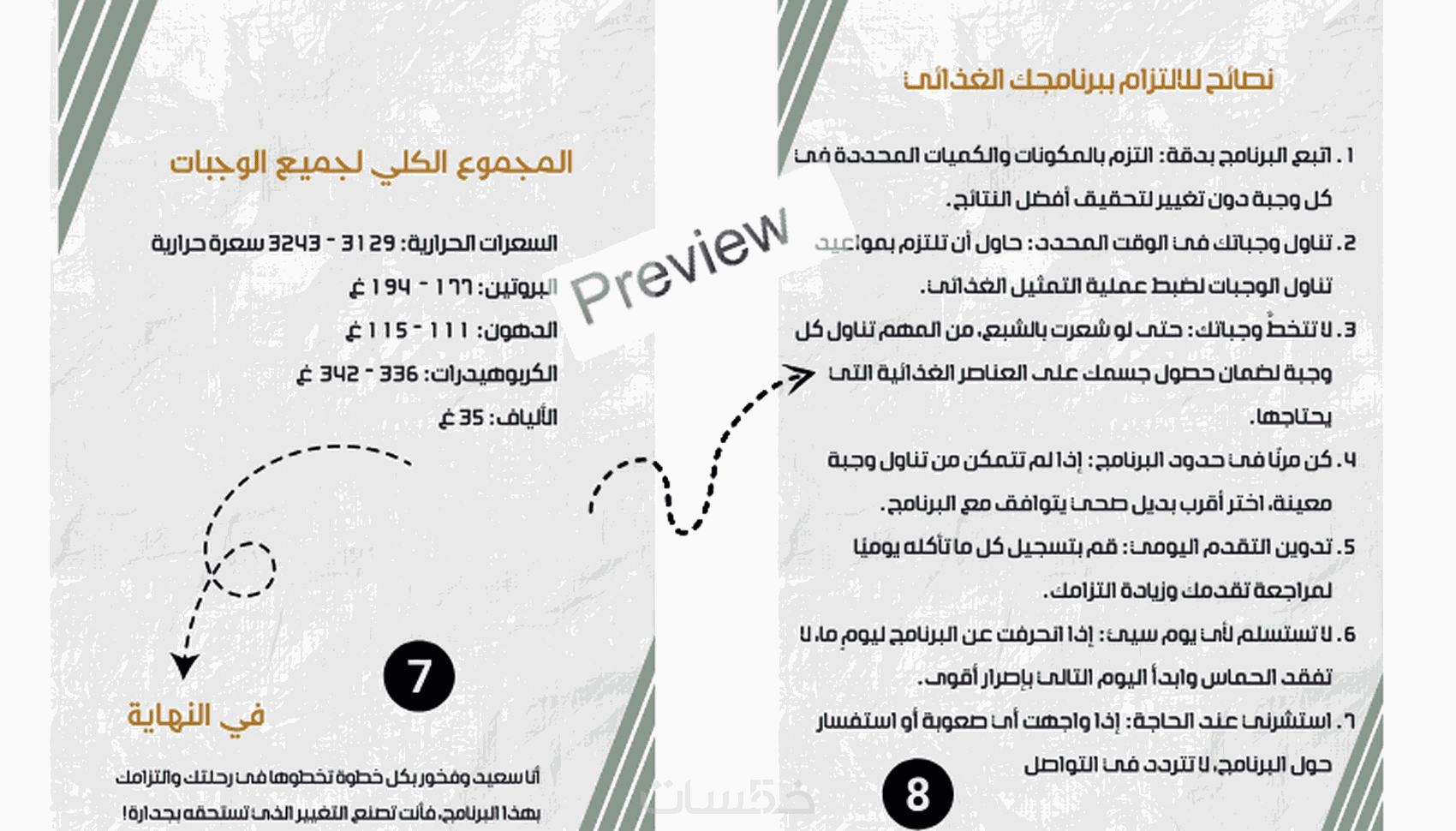 بصفتي اخصائي في مجال اللياقة البدنية والتغذية أقدم لك برنامج غذائي يتماشى مع متطلبات جسدك (حالتك الصحية ، نشاطك البدني، الوزن، الطول أسلوب حياتك وهدفك)