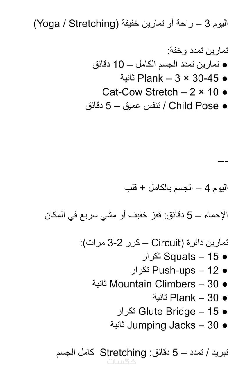 يشمل تمارين منزليه او تمارين في الجيم حسب الرغبه ومستوى النشاط