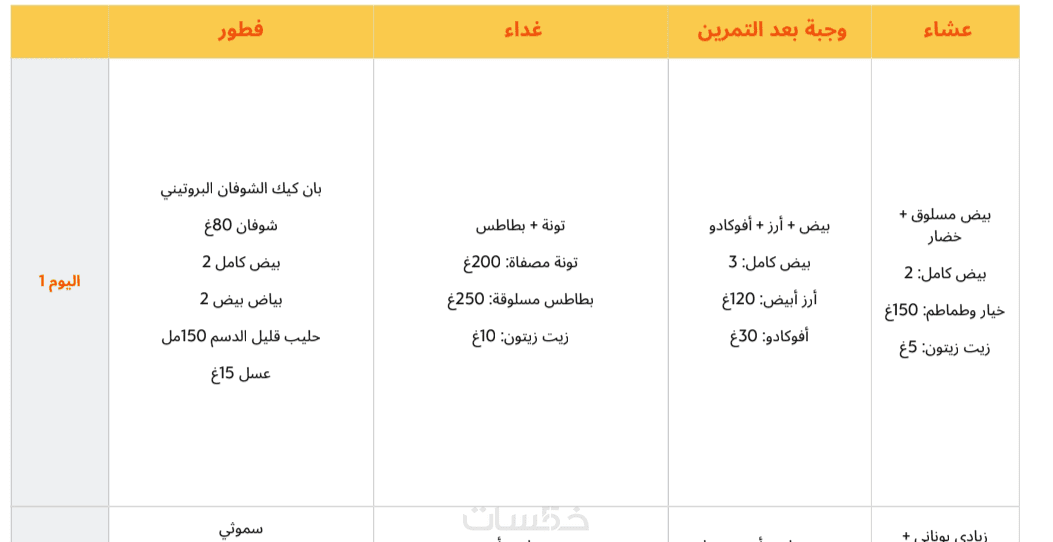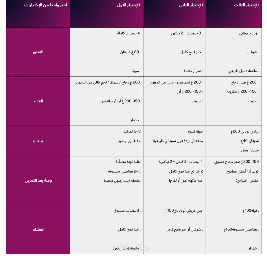 جدول غذائي كامل 40 يوم: مفصل لكل وجبة – فطور، غداء، بعد التمرين، وعشاء خفيف.