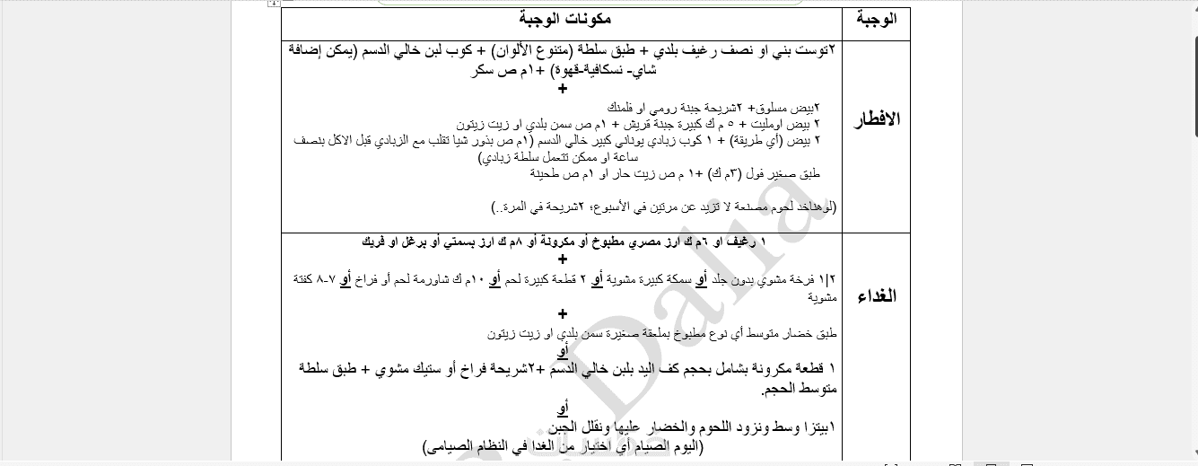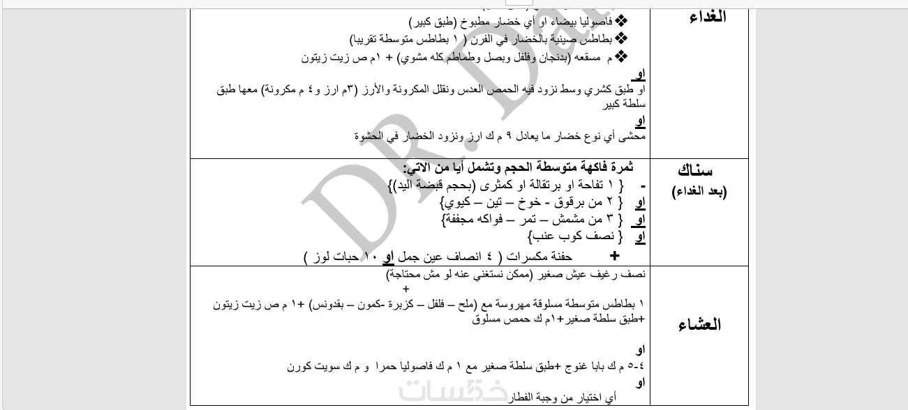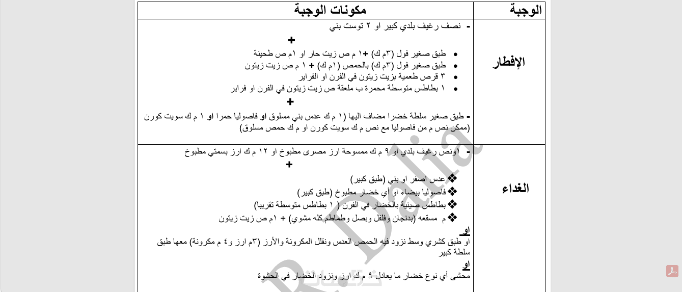 pdf يحتوي على النظام الغذائى حسب الباقة