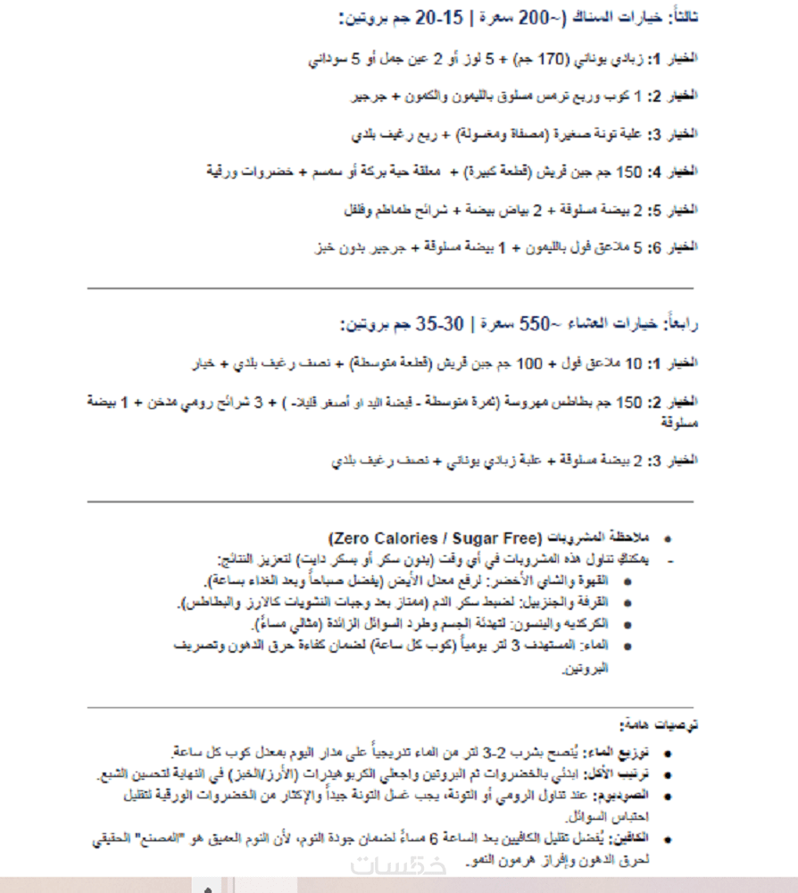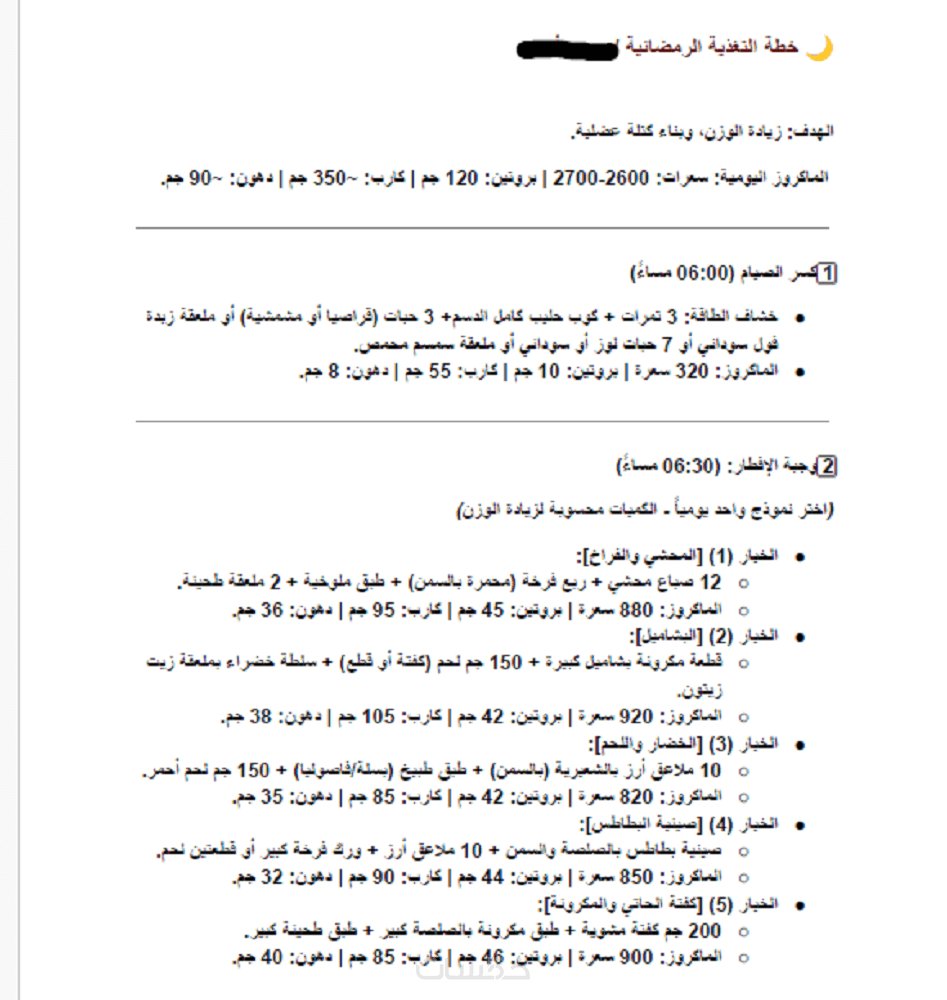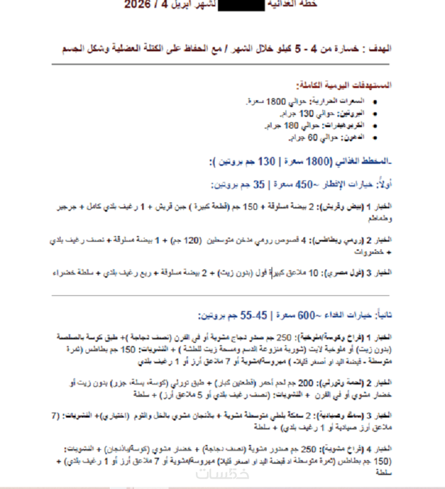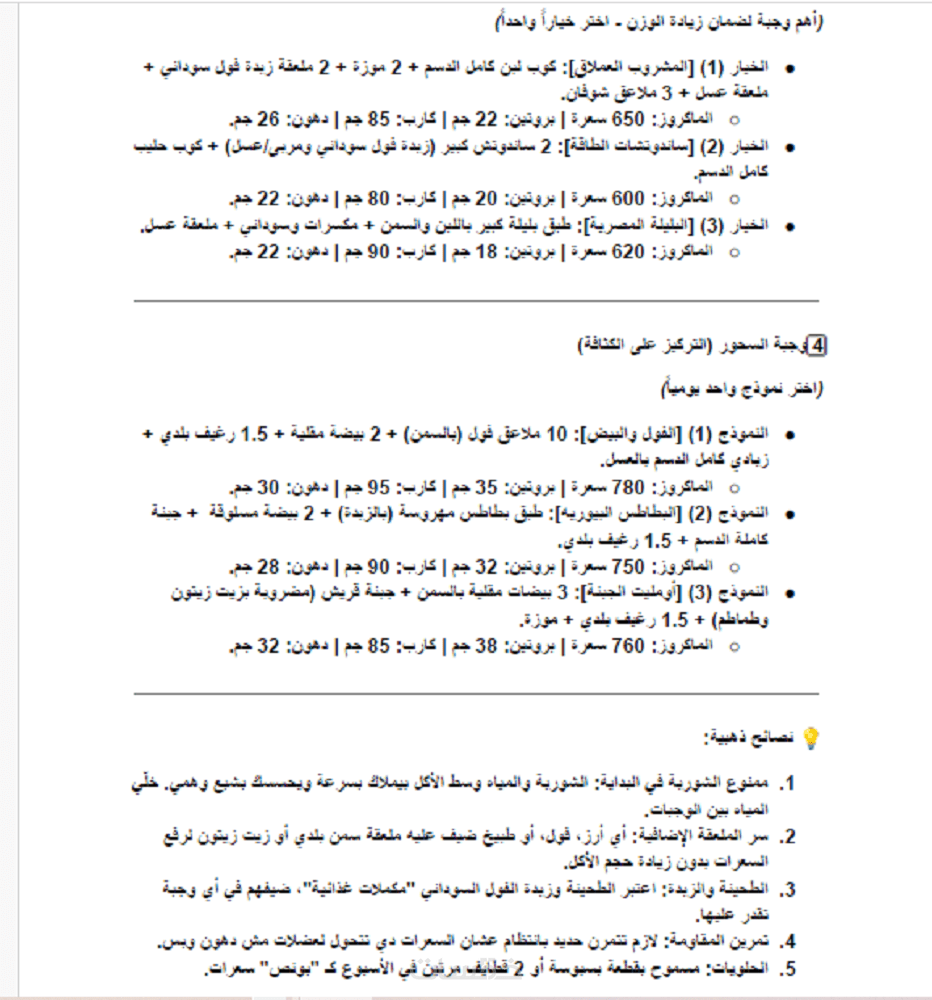 تصميم جدول يومي (فطور، غداء، عشاء، سناك) بناءً على هدفك (خسارة دهون أو زيادة وزن) مع حساب الماكروز (بروتين، كارب، دهون)