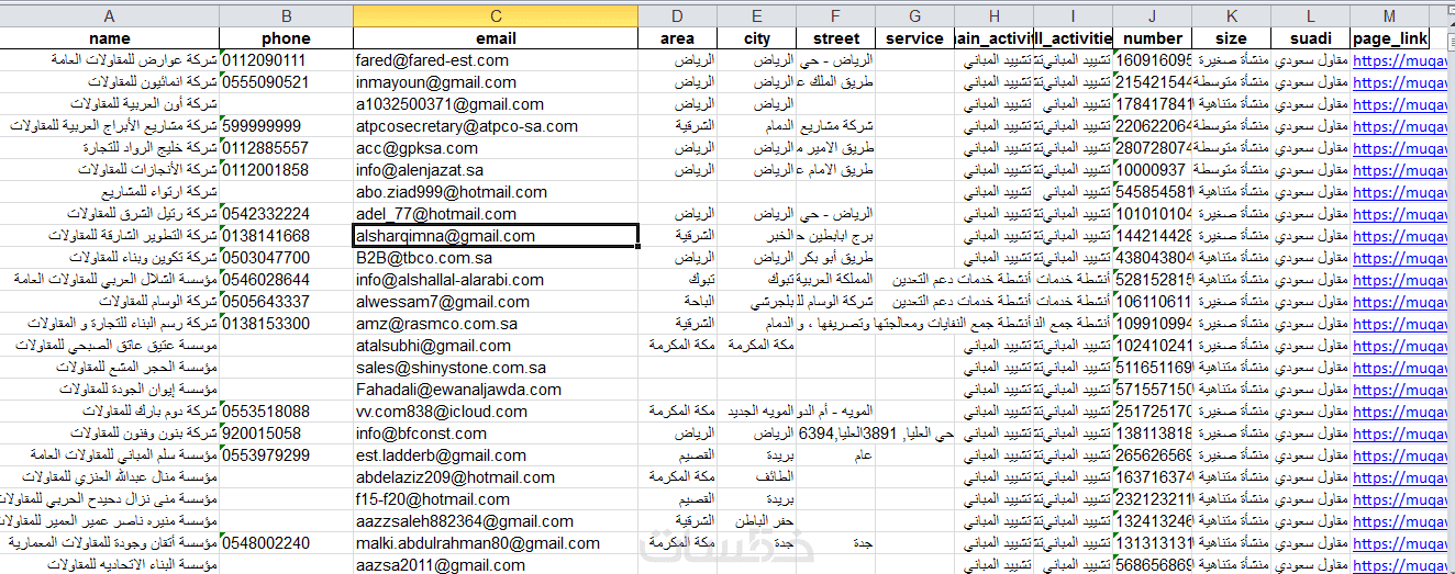 سوف اقدم لك ملف اكسل بيه بيانات 5000 الف شركة مقاولات بالسعودية، الداتا مصنفة الي عدة تصنيفات ( تشييد المباني، الهندسة المدنية، انشطة تقديم الخدمات للمباني وتجيل المواقع، الخ .....)