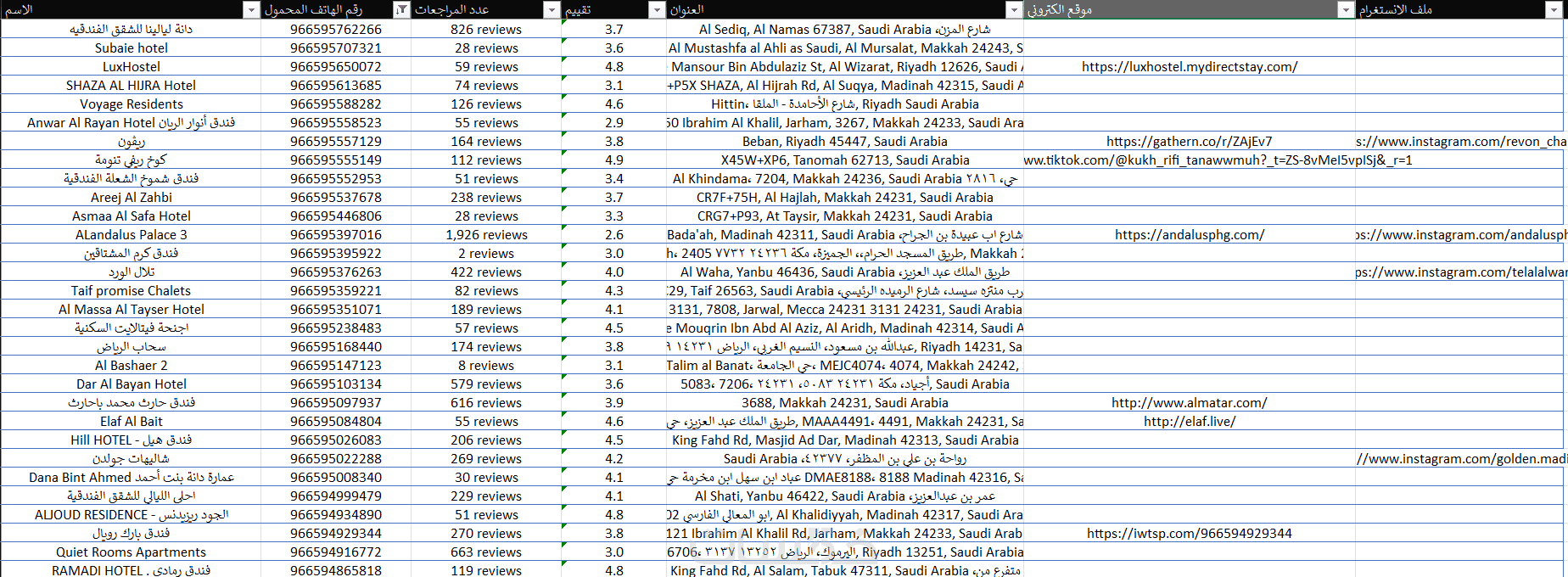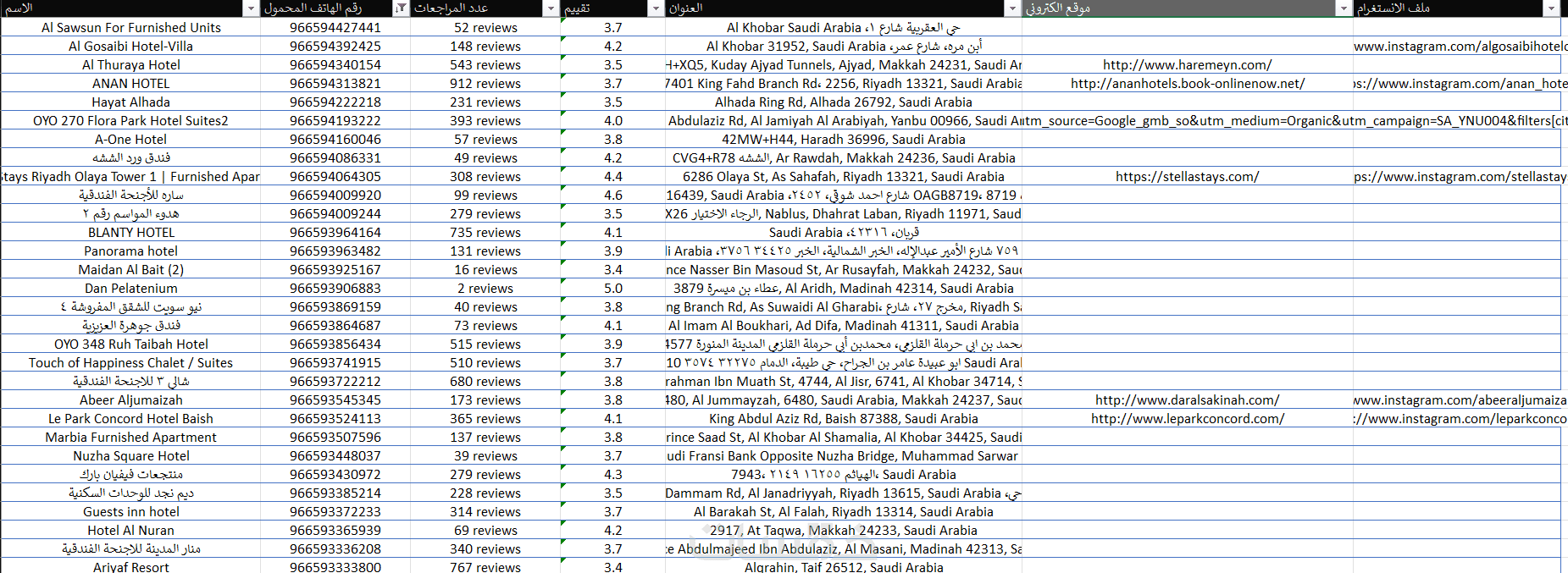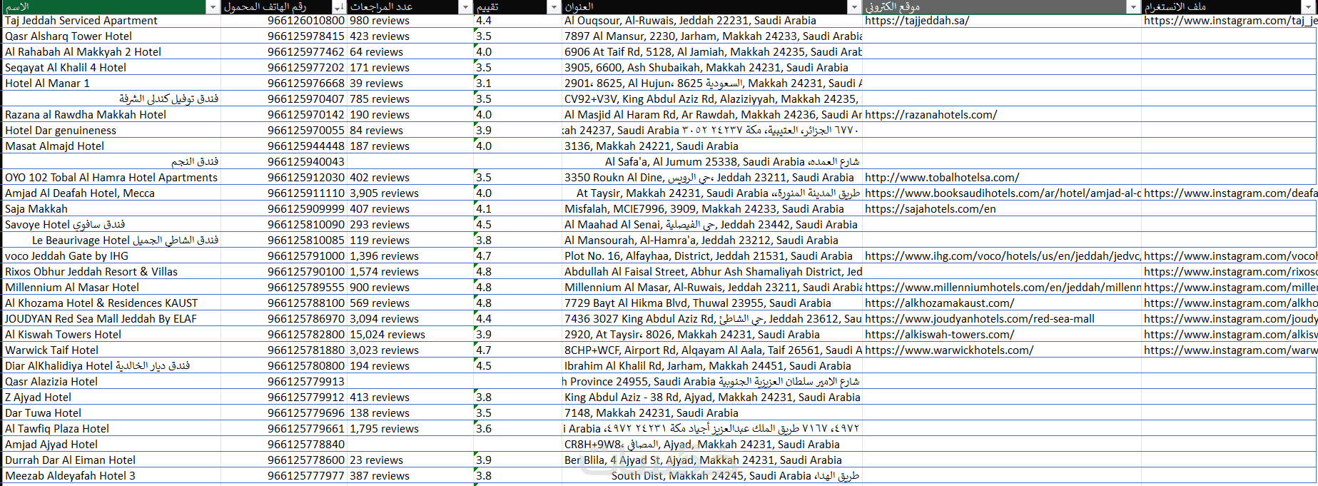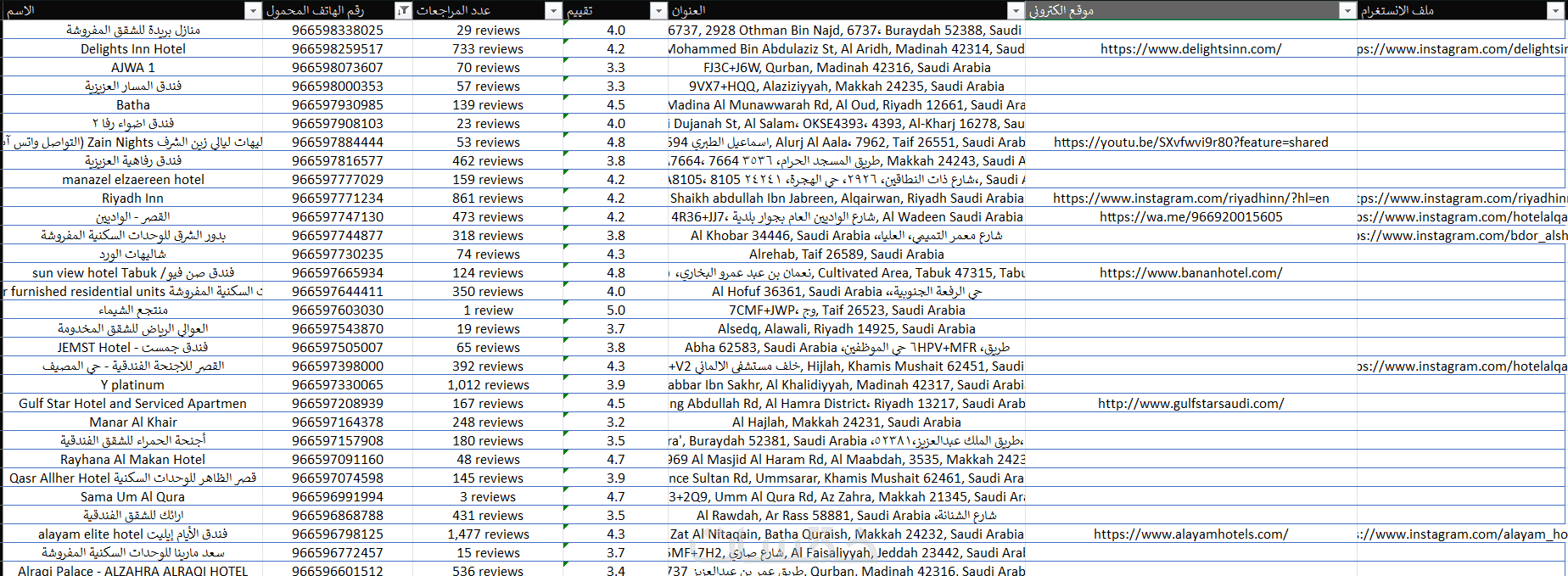 أقدم خدمة متخصصة في توفير قاعدة بيانات دقيقة ومحدثة تحتوي على معلومات التواصل الرسمية للفنادق، الشقق الفندقية، والمنتجعات السياحية في جميع أنحاء المملكة العربية السعودية. هذه البيانات مجمعة ومنظمة خصيصًا للشركات والمؤسسات التي تستهدف قطاع الضيافة والسياحة.