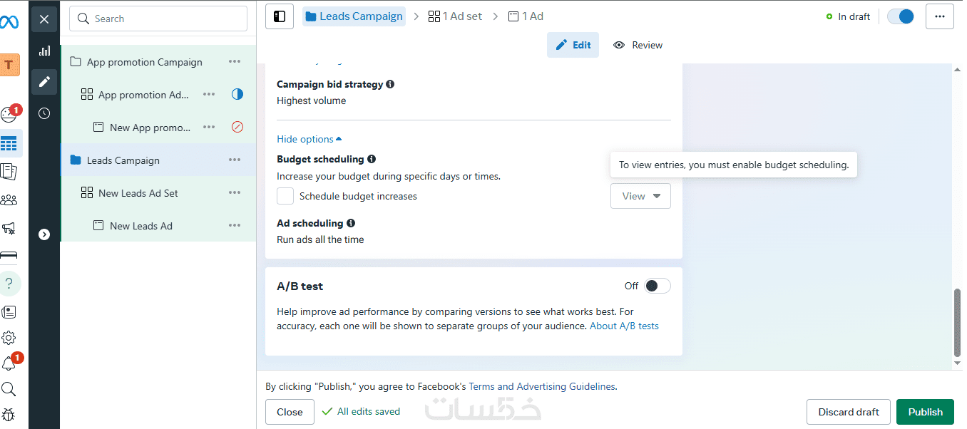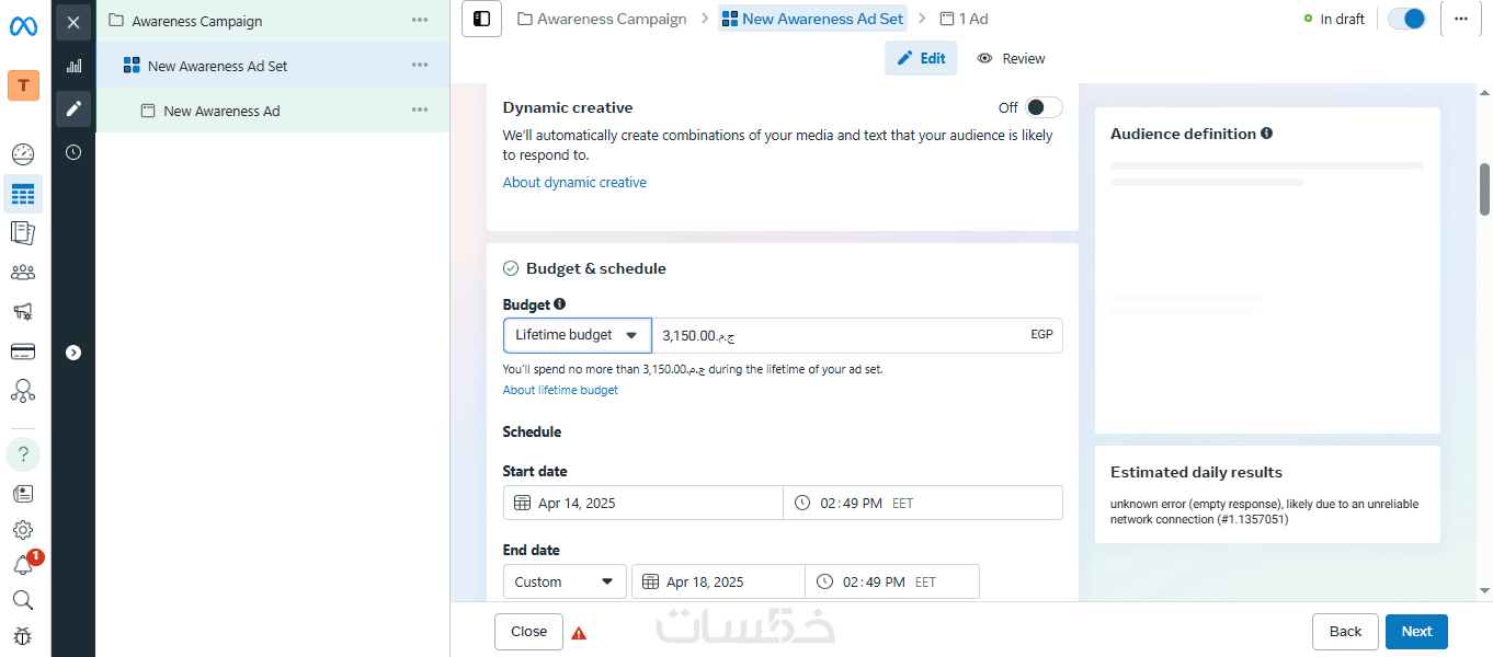 أُطلق الحملة باستخدام أدوات ميتا الرسمية (مدير الإعلانات)، مع ضبط جميع الإعدادات الفنية المطلوبة مثل الميزانية، المدة، وأماكن عرض الإعلان.