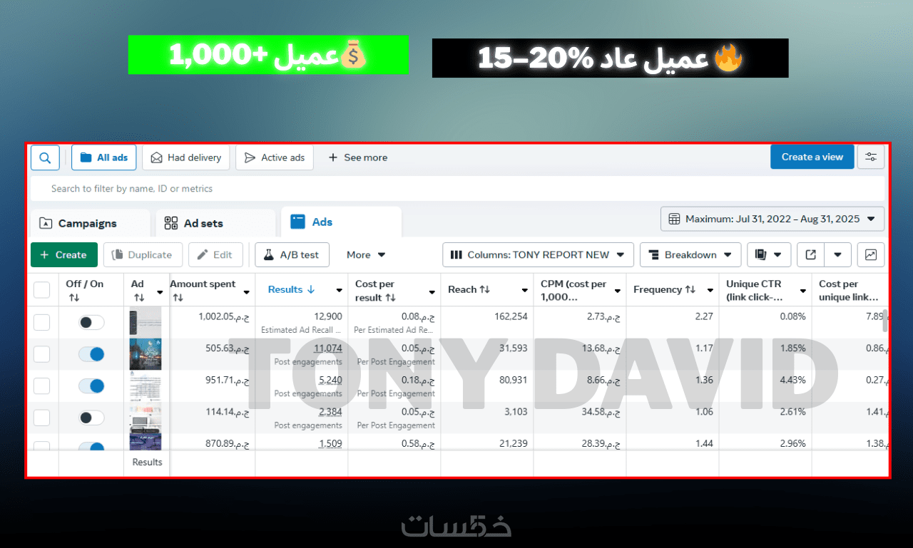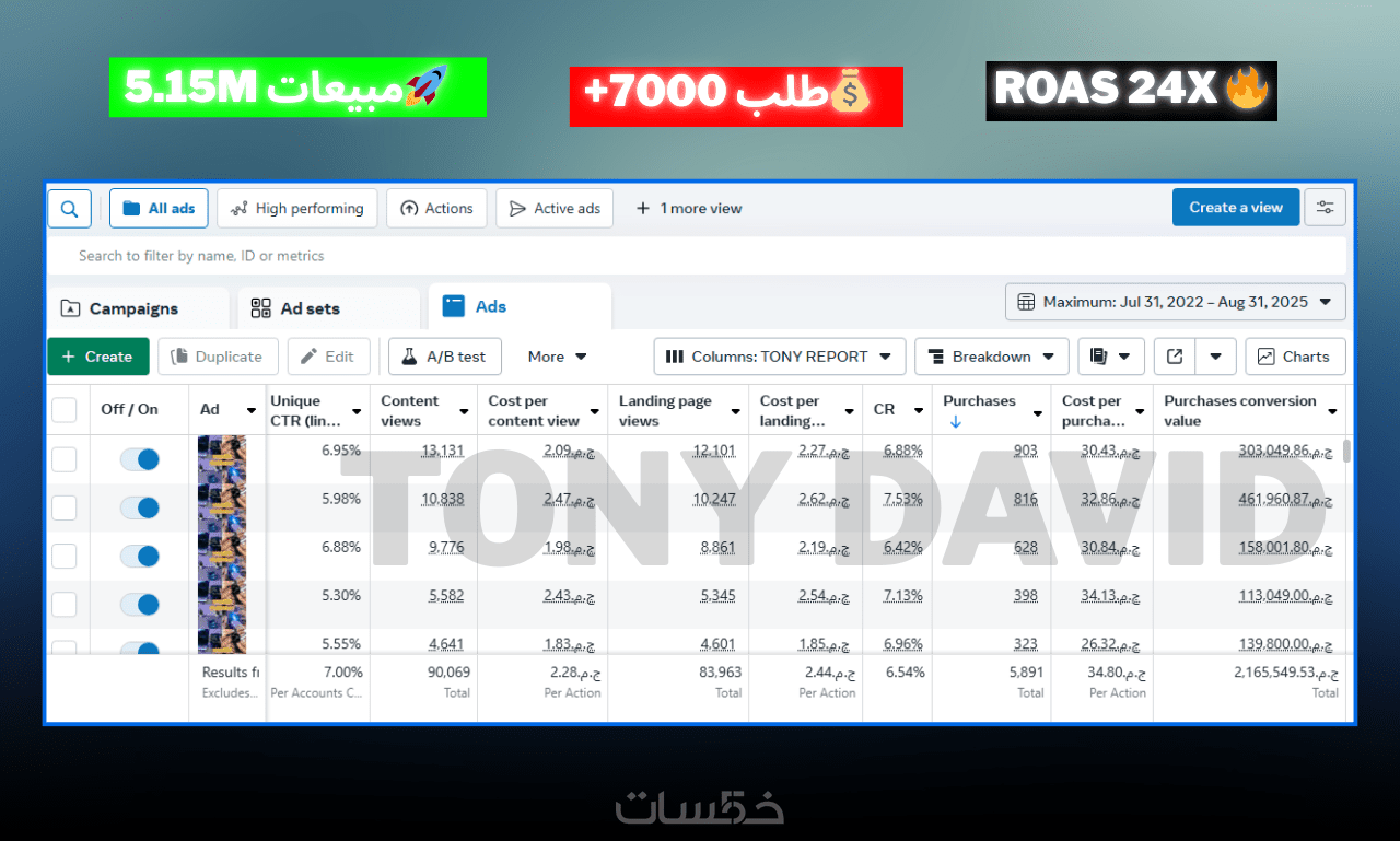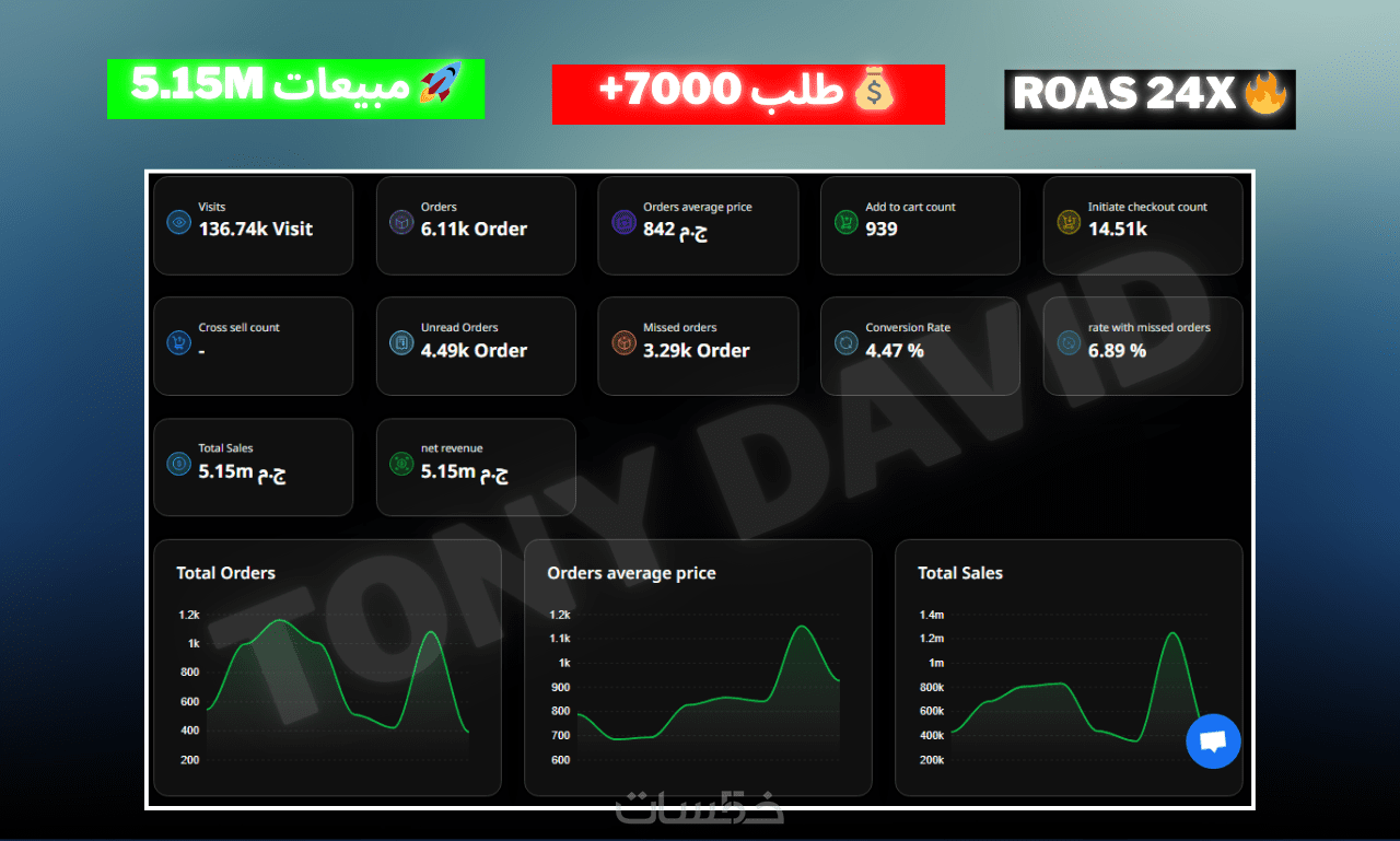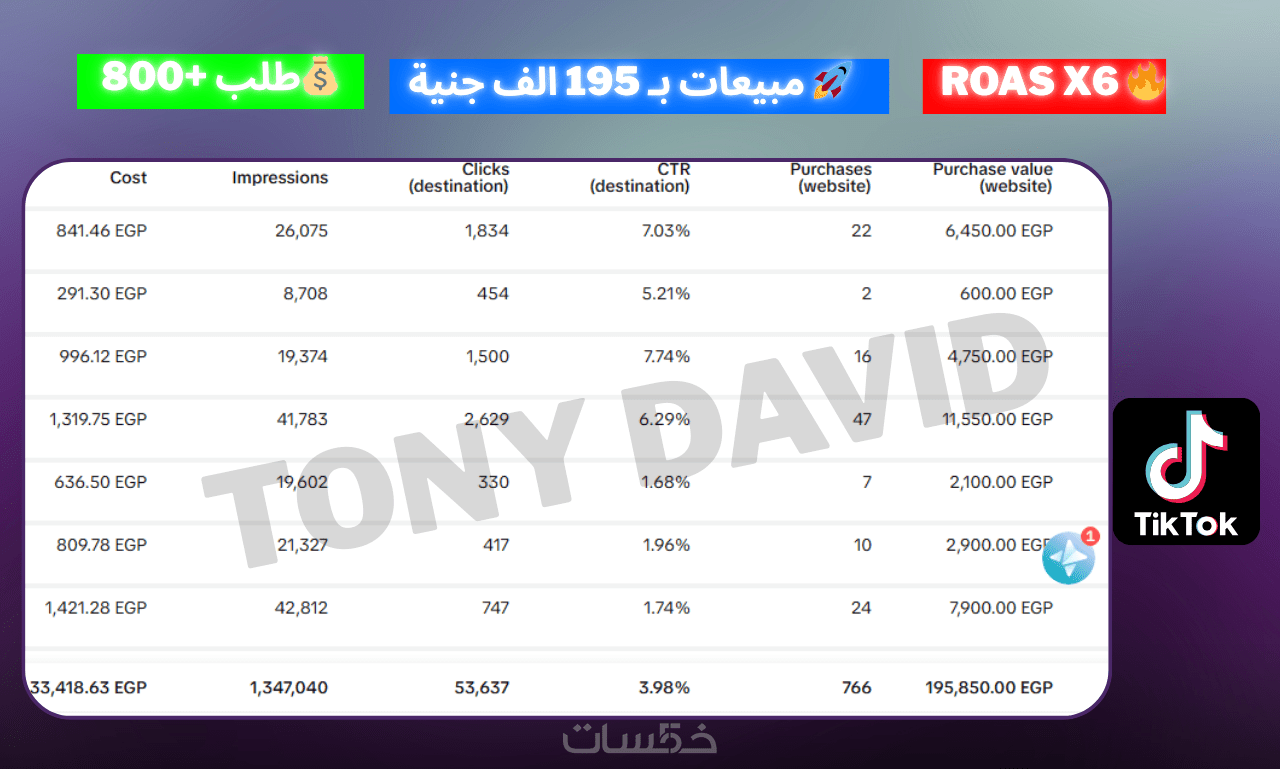 أنا توني، خبير تسويق إلكتروني وإدارة حملات إعلانية (Media Buyer). قمت بإدارة ميزانية إعلانية تزيد عن 250,000 جنيه مصري، وحققت أكثر من 8,000 طلب شراء ومبيعات بقيمة 5.5 مليون جنيه مصري، مع عائد على الإنفاق الإعلاني (ROAS) وصل إلى 24 ضعف.