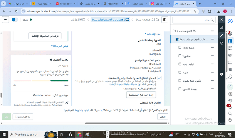 يضبط خبير الإعلانات مكان ظهور إعلانك سواءً في القصة أم الأكسبلور أم الريلز وغيره، ويعرض في أثناء ذلك الحجم المطلوب لكل نوع إعلاني للتحقق من صحته قبل نشره.