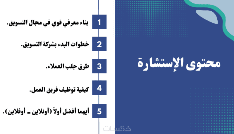 الاستشارات التسويقية هي المعرفة التي تحتاجها لكي تحقق أفضل نتائج من جهودك التسويقية، ونظرًا لتنوع طرق وأساليب التسويق، تشمل الاستشارات التسويقية كافة الجوانب المتعلقة بها، على سبيل المثال: