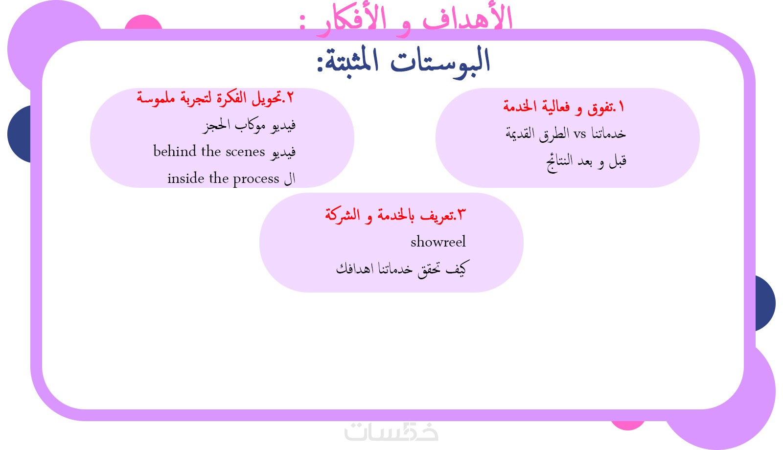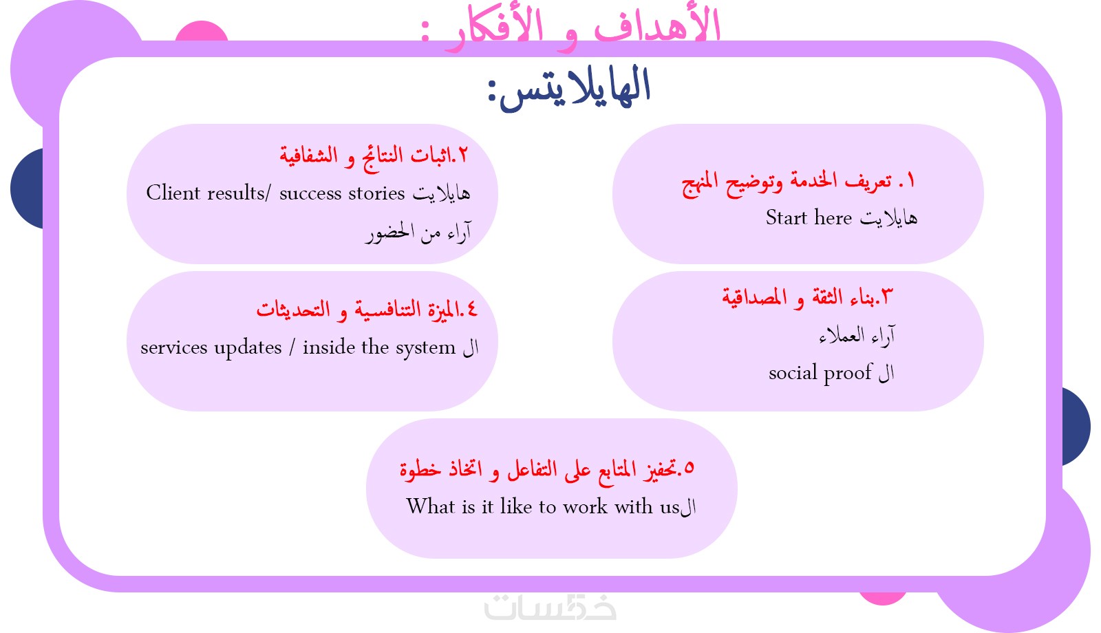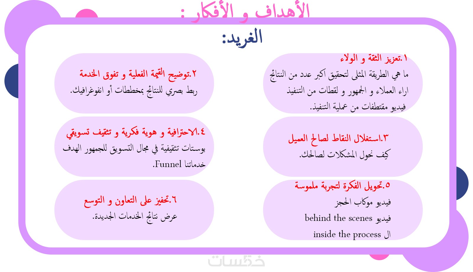 ٥.تقديم 5 أفكار محتوى قابلة للتكرار مبنية على أهداف تسويقية واضحة، مع شرح دور كل فكرة لتسهيل التنفيذ لاحقاً من قبلك أو من قبل فريقك.