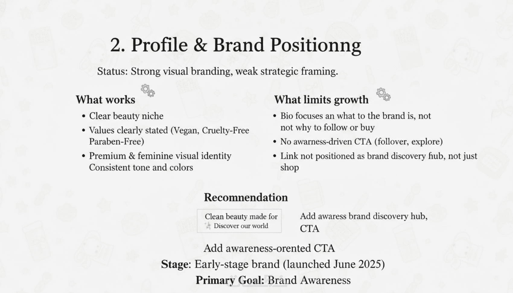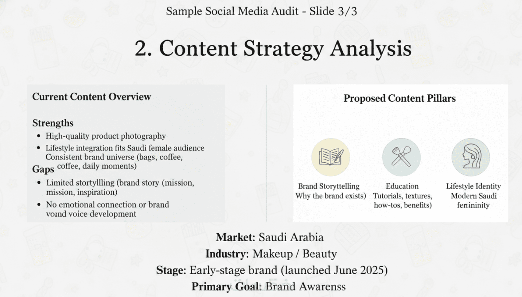 مراجعة استراتيجية المحتوى، جودة المنشورات، مستوى التفاعل مع الجمهور، استخدام الحملات المدفوعة، وتحليل الأداء العام.
