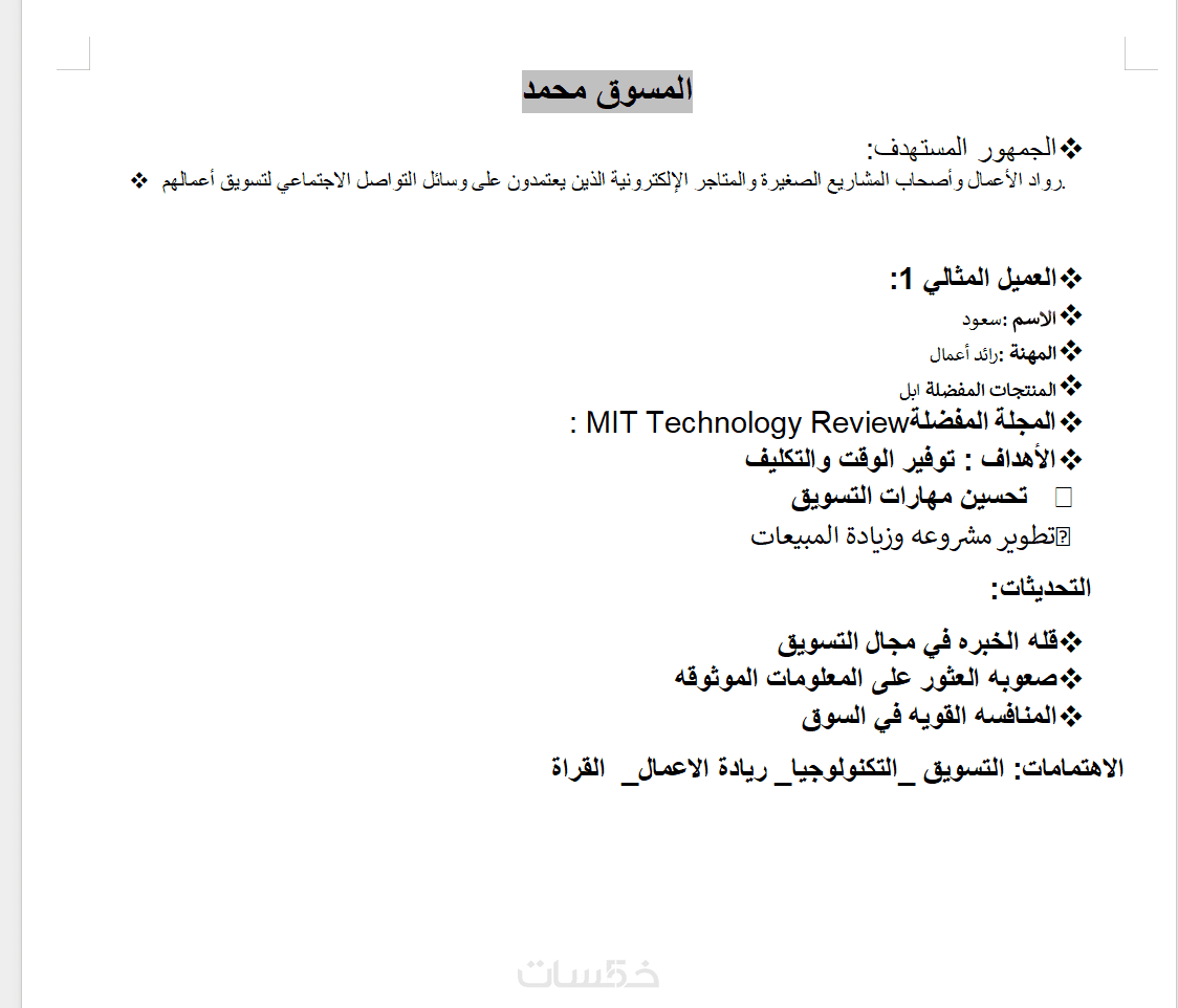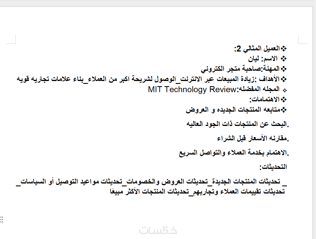 1-تحليل مفصل لشخصية العميل المثالي (الاسم، العمر، الموقع، الاهتمامات).