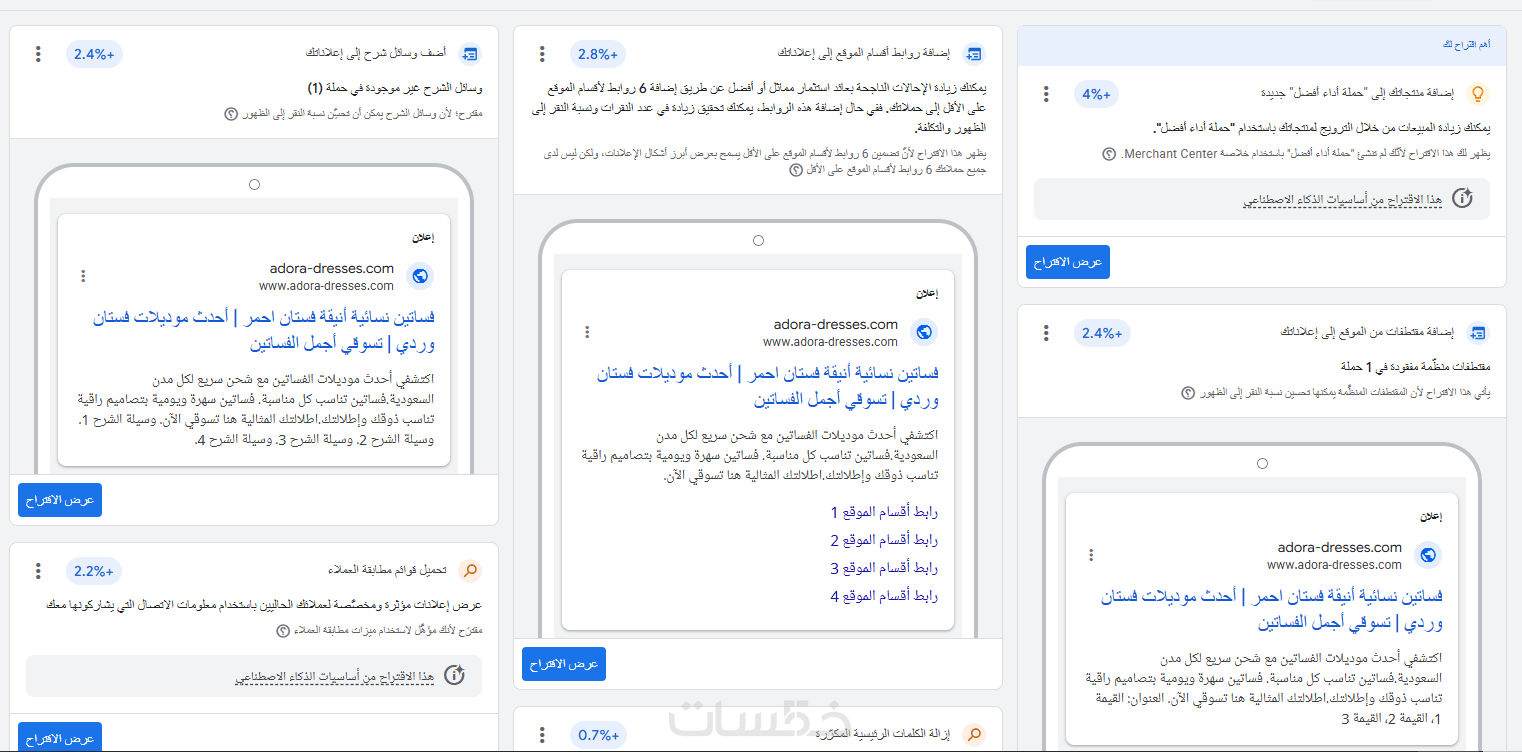 تحسين الحملة باستخدام إضافات الإعلانات مثل الروابط الفرعية، الاتصال، العروض، وإبراز المزايا.