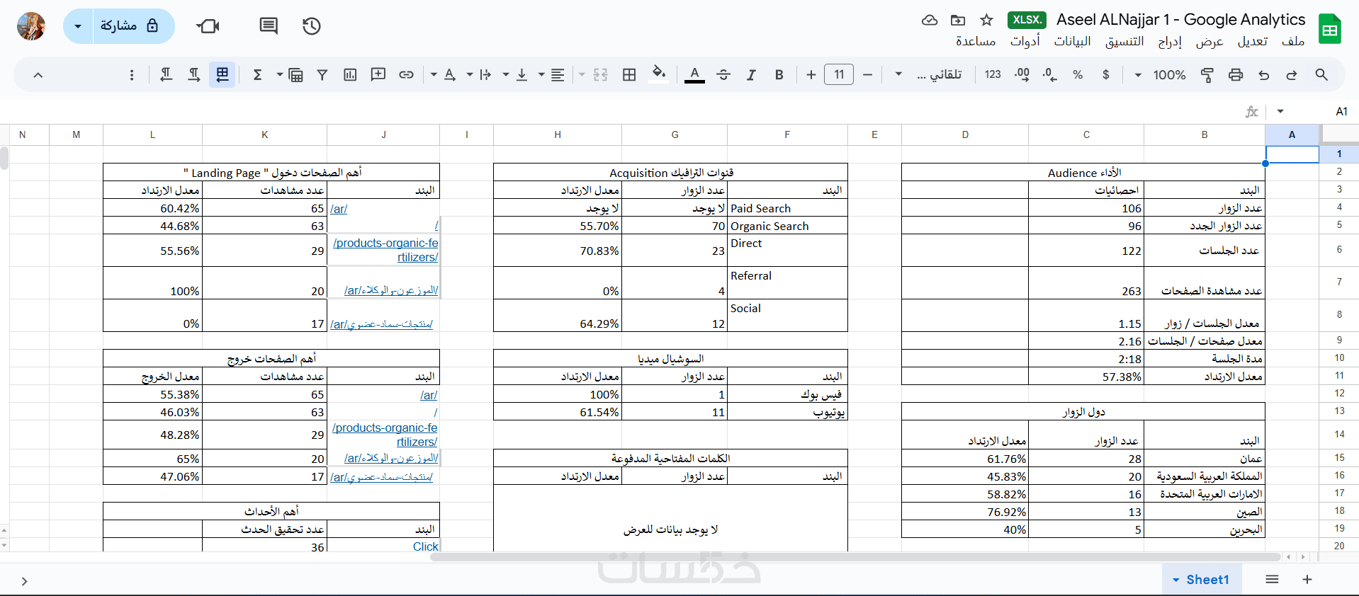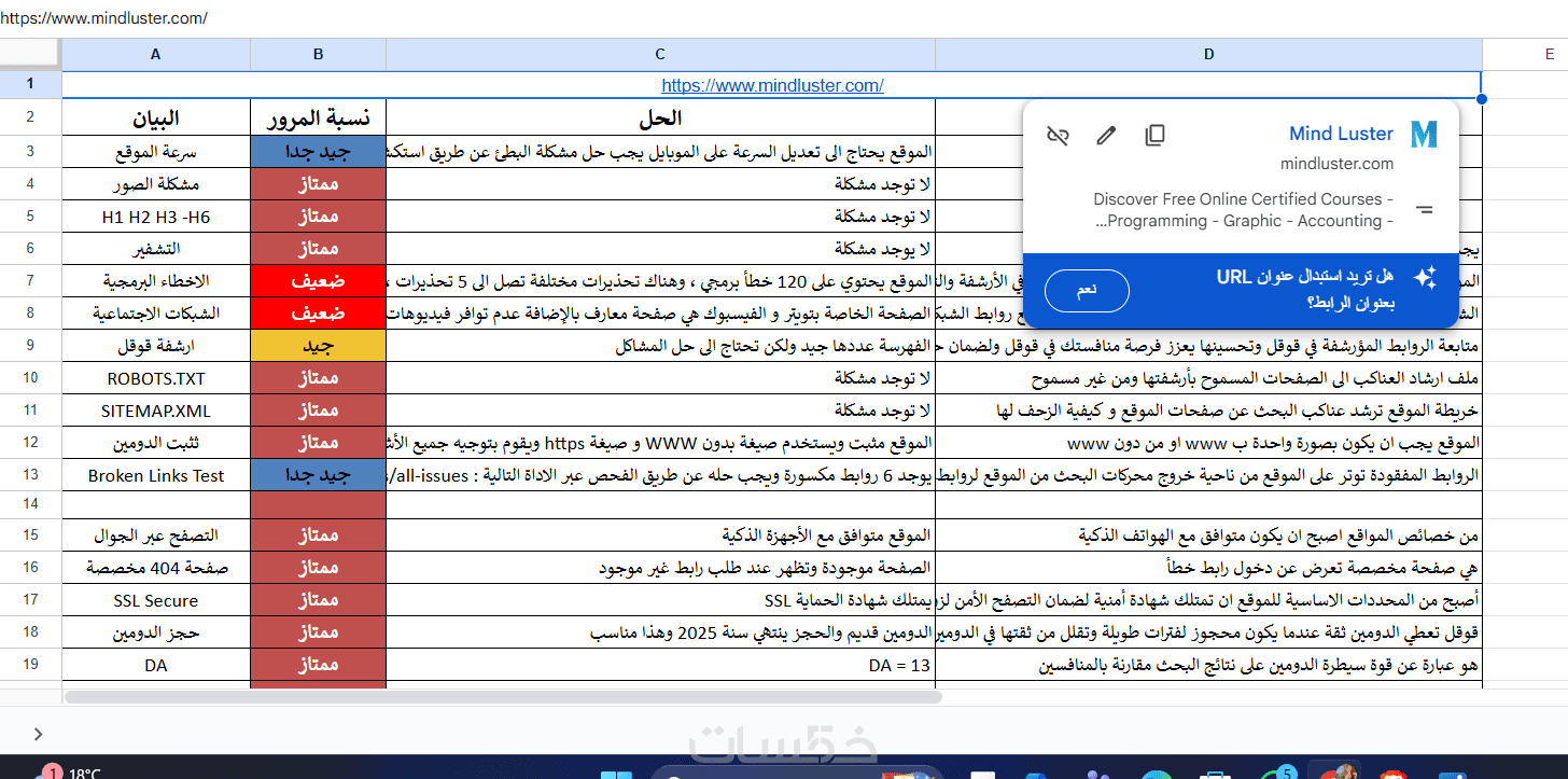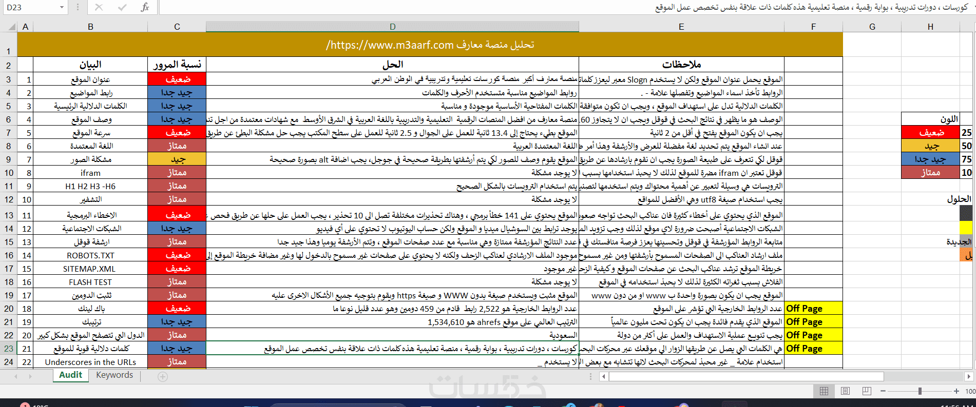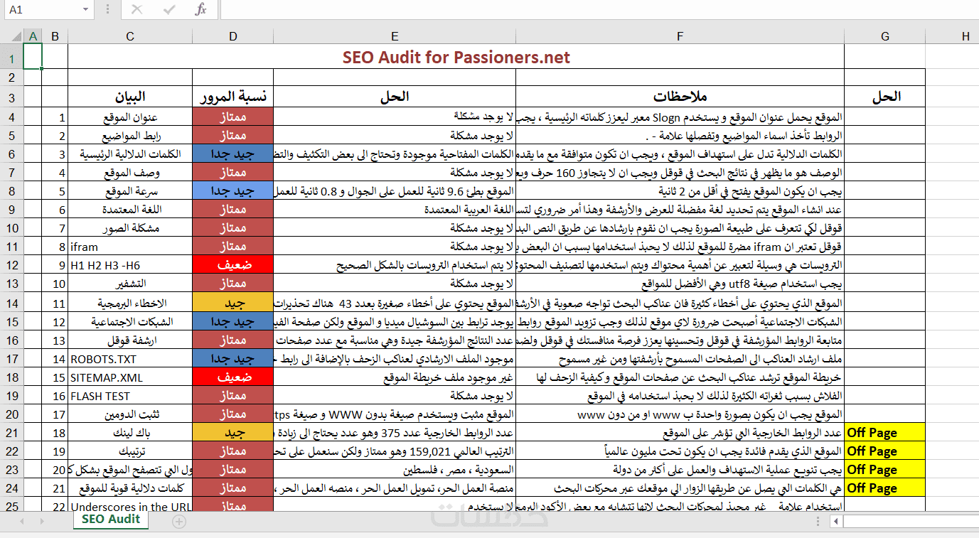* ملف شامل يحتوي على 15 بند من أجل فحص الموقع في ملف اكسل (Robots.txt - Keywords - Indexing - Sitemap - Heading - Image Alt ..etc)