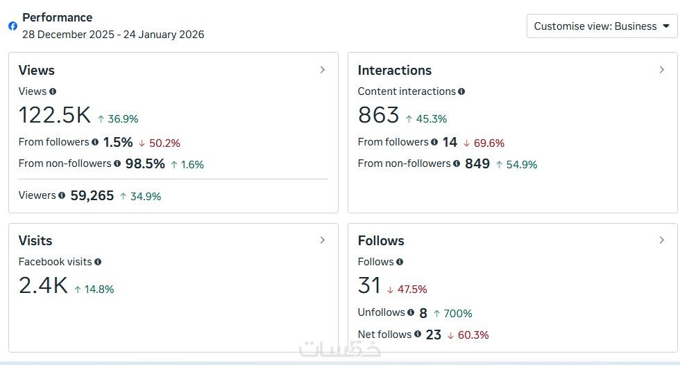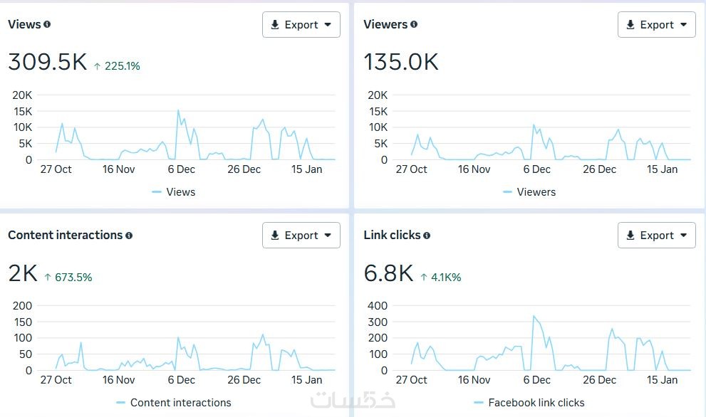 • تحليل مفصل لأرقام ومؤشرات الأداء الرئيسية (المتابعون، الوصول، التفاعل، النقرات...).