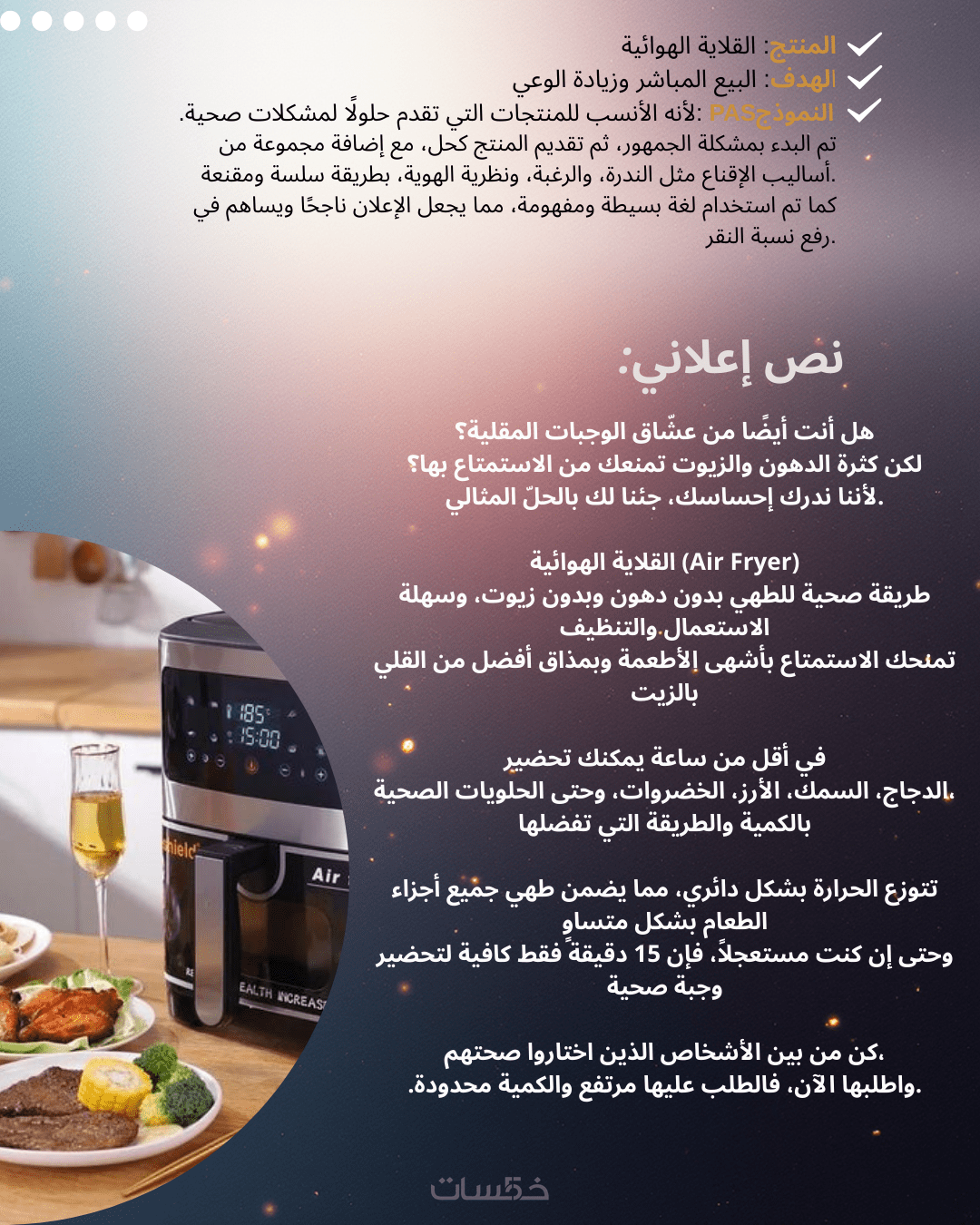3 نصوص اعلانية كاملة (100 كلمة) +2 نسخ قصيرة جاهزة للنشر (30 كلمة)