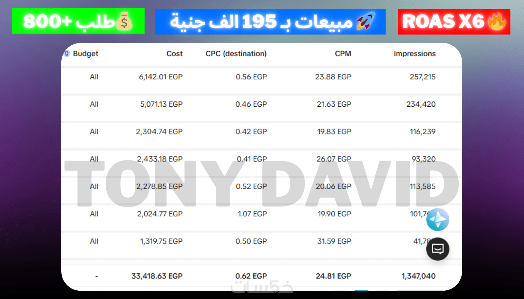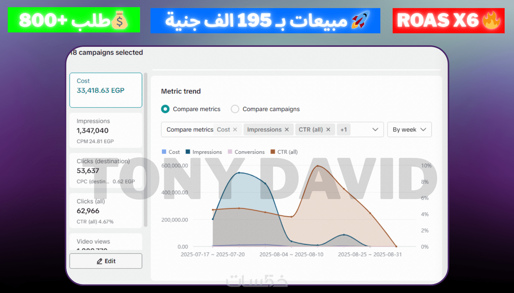 أنا توني، خبير تسويق إلكتروني وإدارة حملات إعلانية (Media Buyer). قمت بإدارة ميزانية إعلانية تزيد عن 250,000 جنيه مصري، وحققت أكثر من 8,000 طلب شراء ومبيعات بقيمة 5.5 مليون جنيه مصري، مع عائد على الإنفاق الإعلاني (ROAS) وصل إلى 24 ضعف.