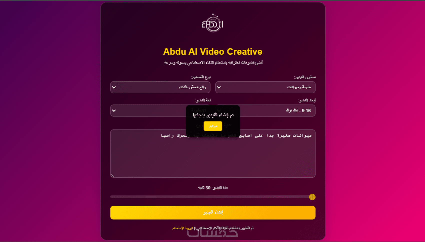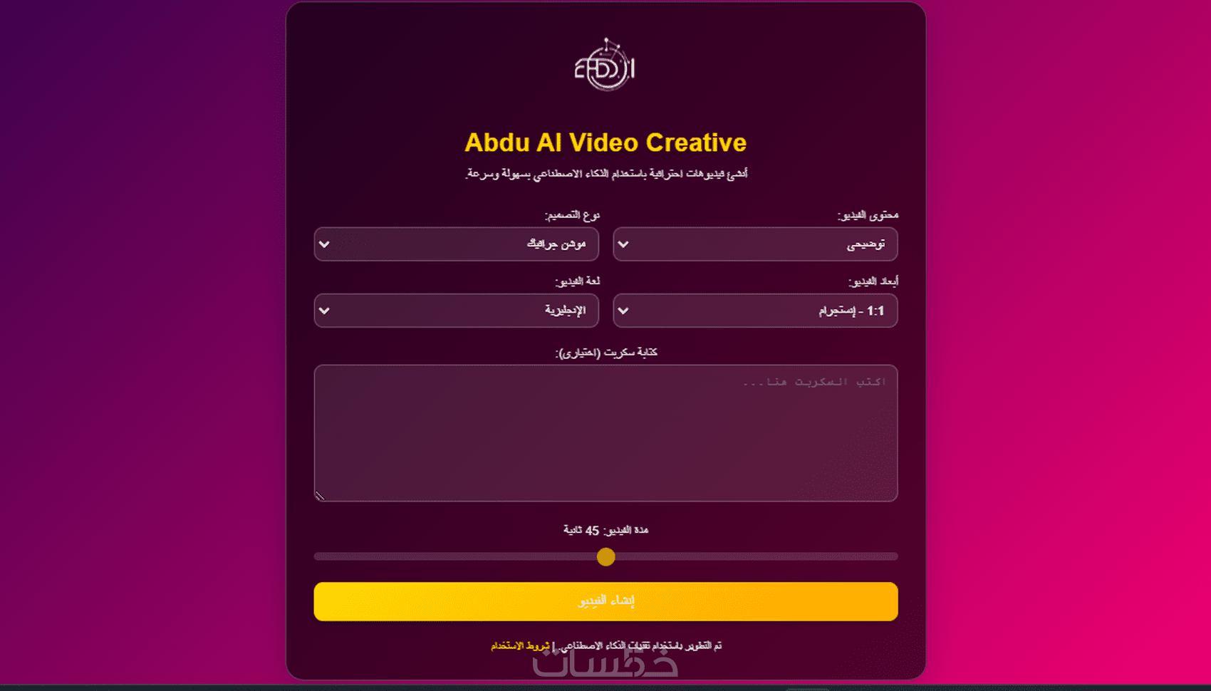 هل ترغب في إنشاء فيديوهات احترافية بسرعة وسهولة؟ أقدم لك أداة مبرمجة خصيصًا لاحتياجاتك تعمل على إنشاء فيديوهات باستخدام تقنيات الذكاء الاصطناعي، دون الحاجة إلى الاعتماد على منصات جاهزة أو دفع رسوم شهرية.
