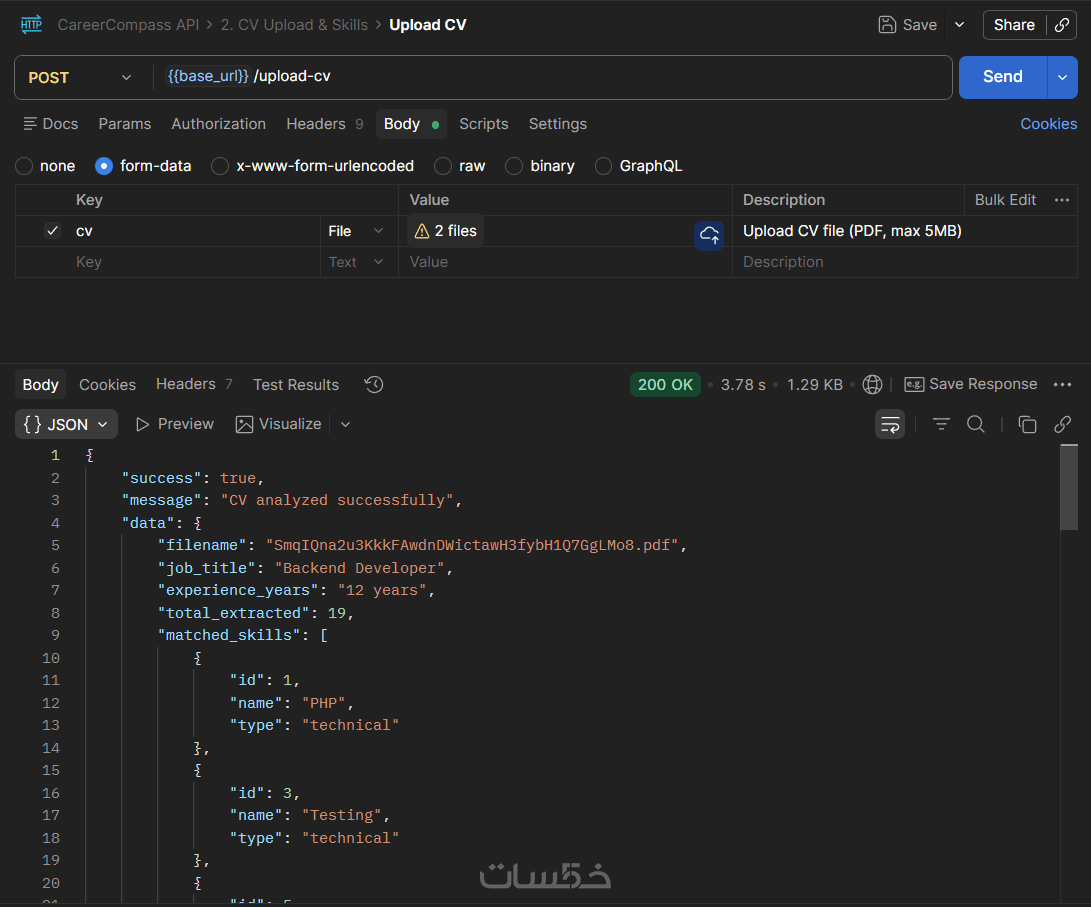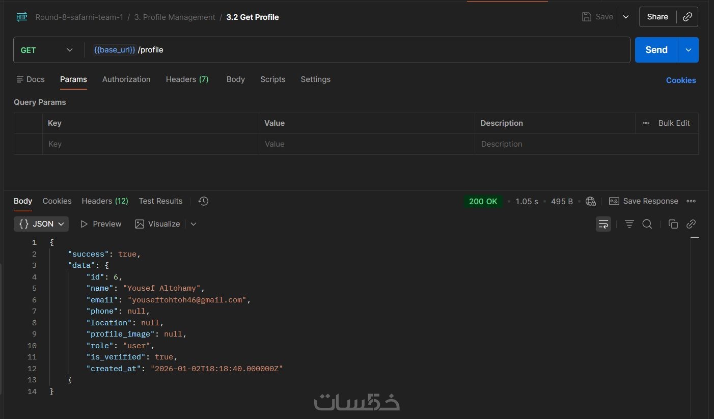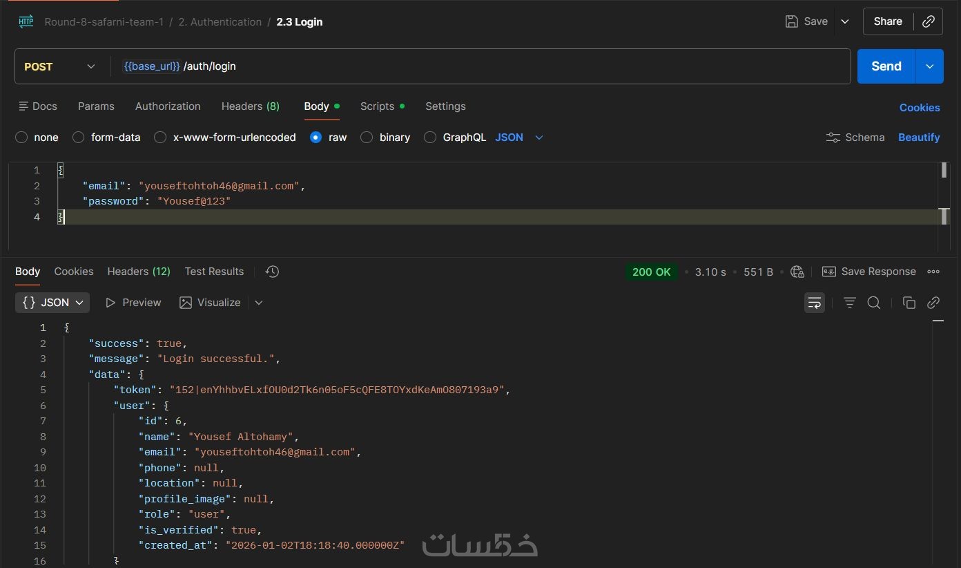 ملف Postman Collection يحتوي على تفاصيل كل مسار (المدخلات والمخرجات) لتسهيل عمل مطور الواجهات (Front-end) أو الموبايل أثناء الربط.