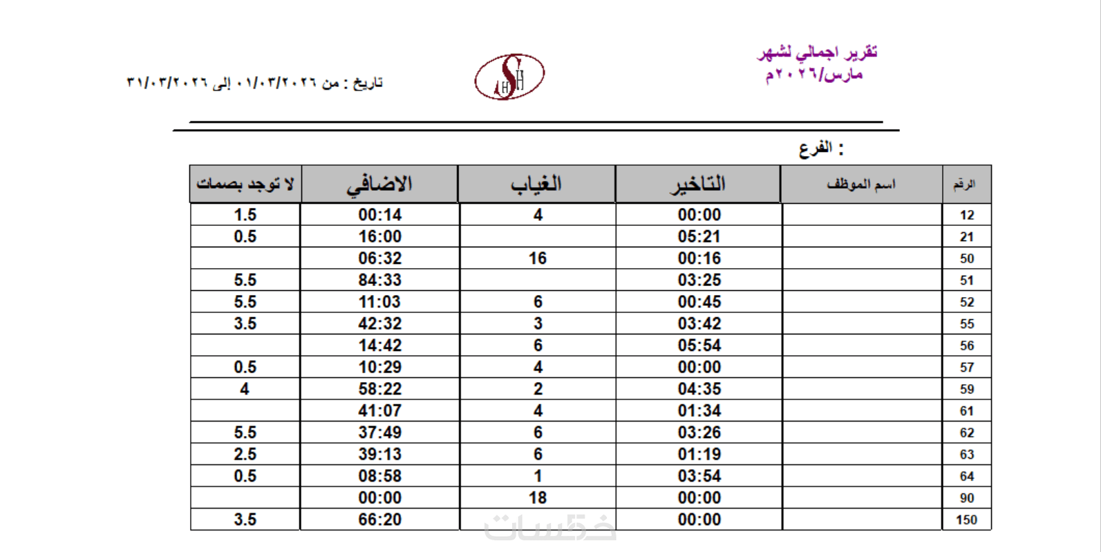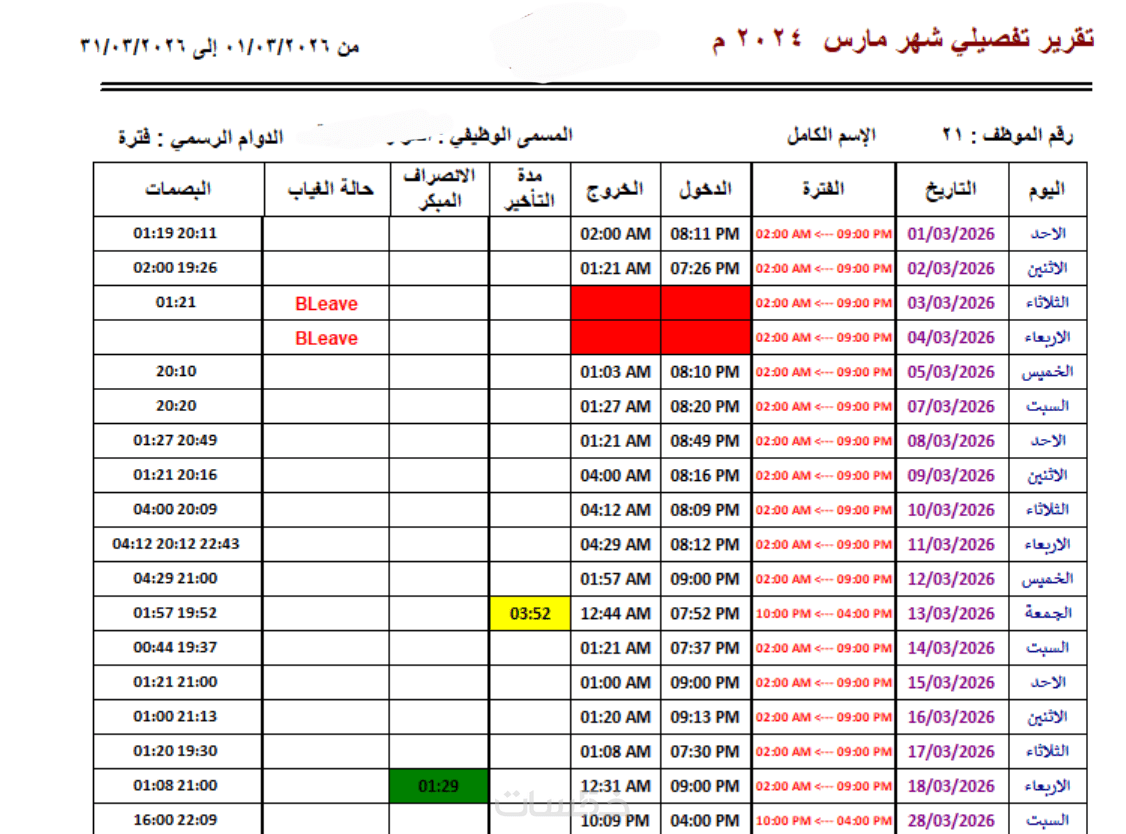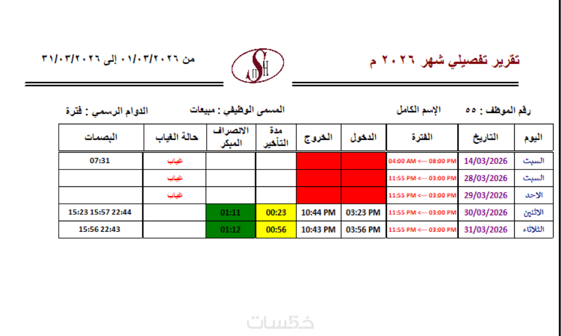 · تقرير الغياب والتأخير: حصر الموظفين المتغيبين والمتأخرين بدقائق التأخير.