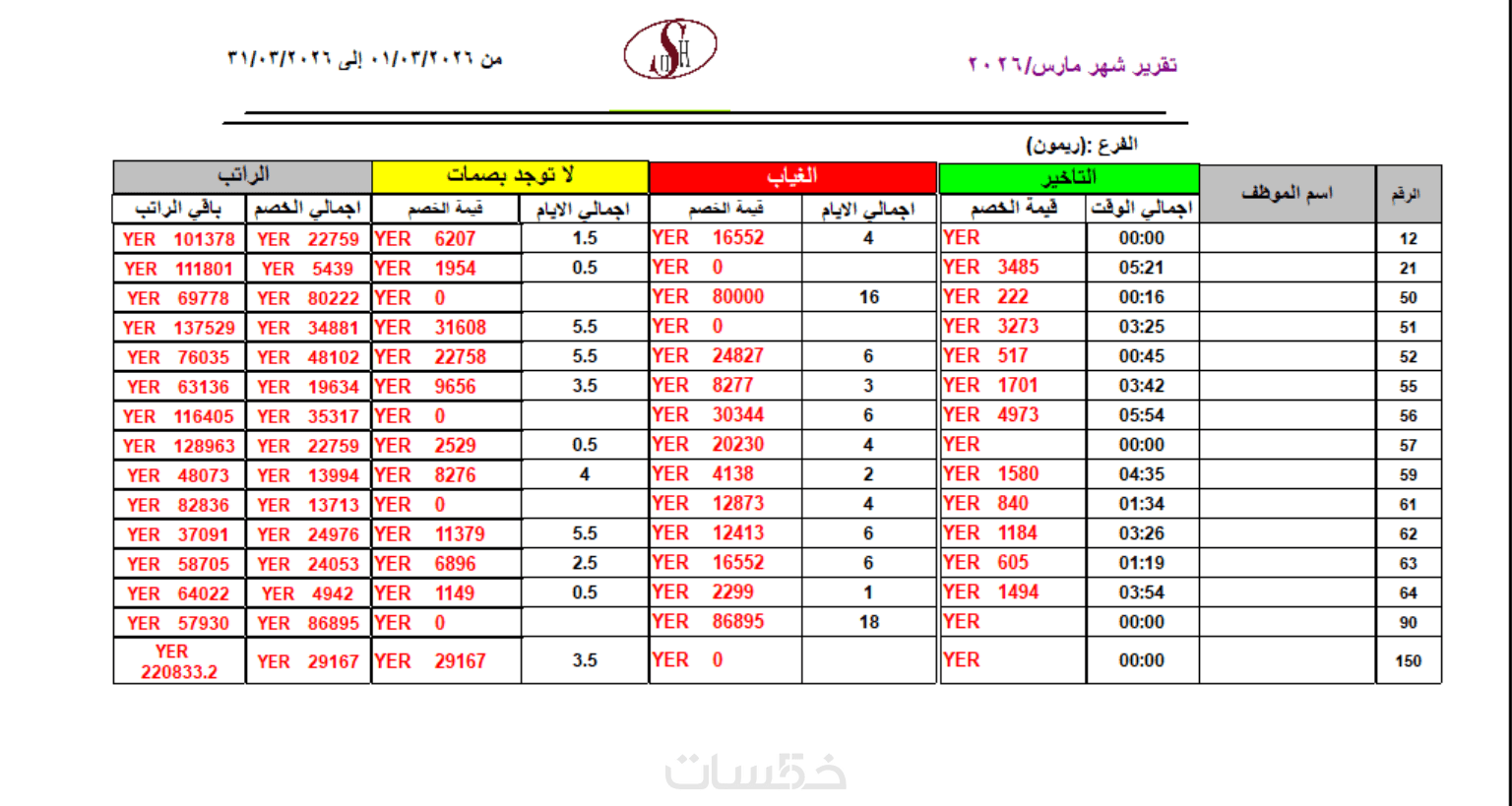 ·تقرير الخصومات (الحصري): ربط الغياب والتأخير بالراتب لخصم القيم تلقائيا
