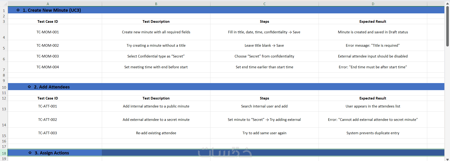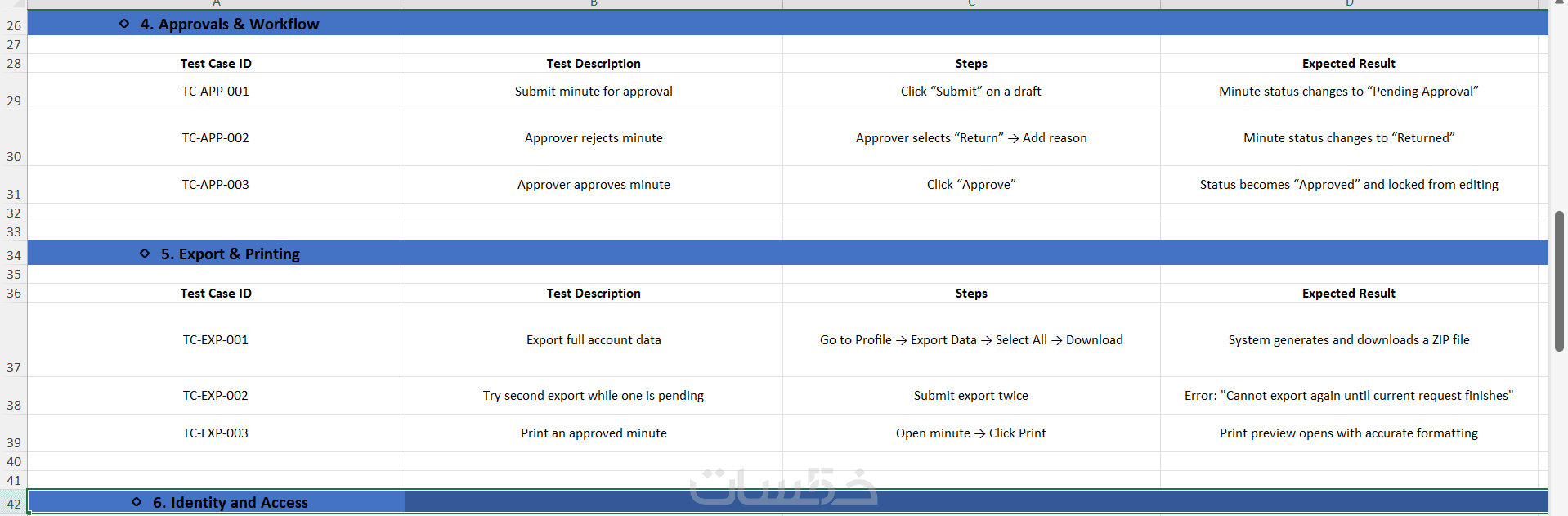 توثيق السيناريوهات وخطوات الاختبار المتبعة ونتائجها بشكل منظم.