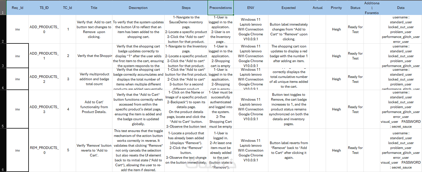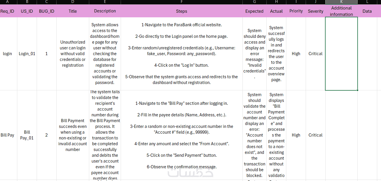 كتابة ملف Test Cases كامل بصيغة Excel يشمل الخطوات والنتائج المتوقعة لكل سيناريو