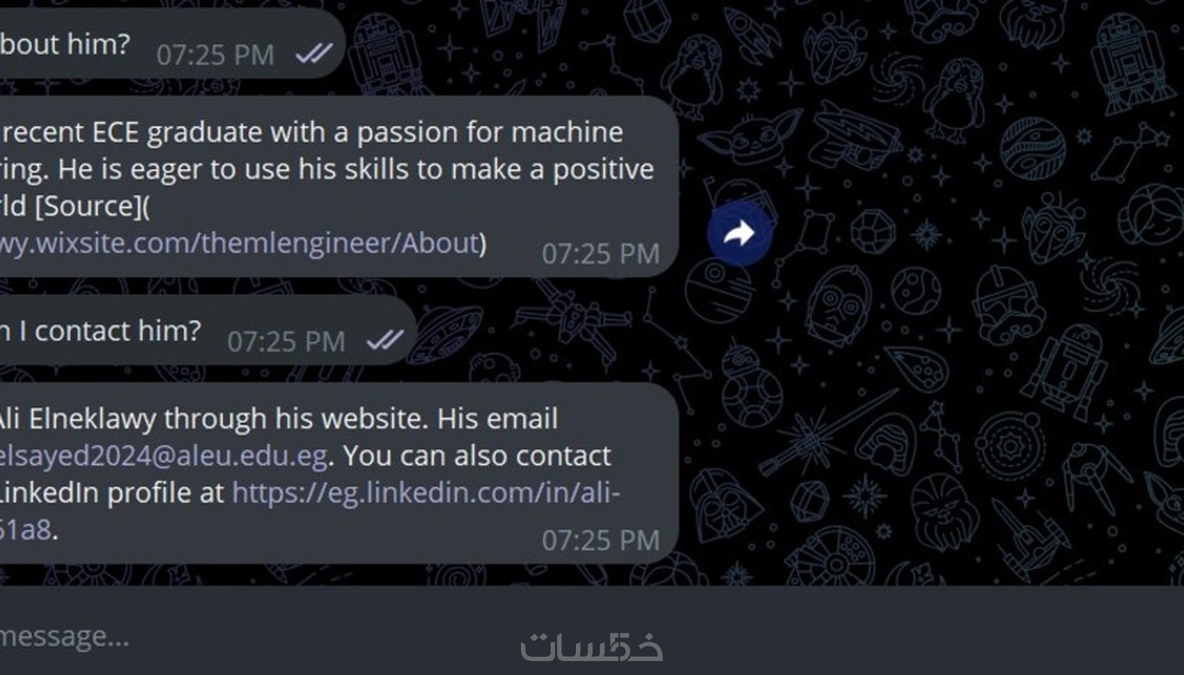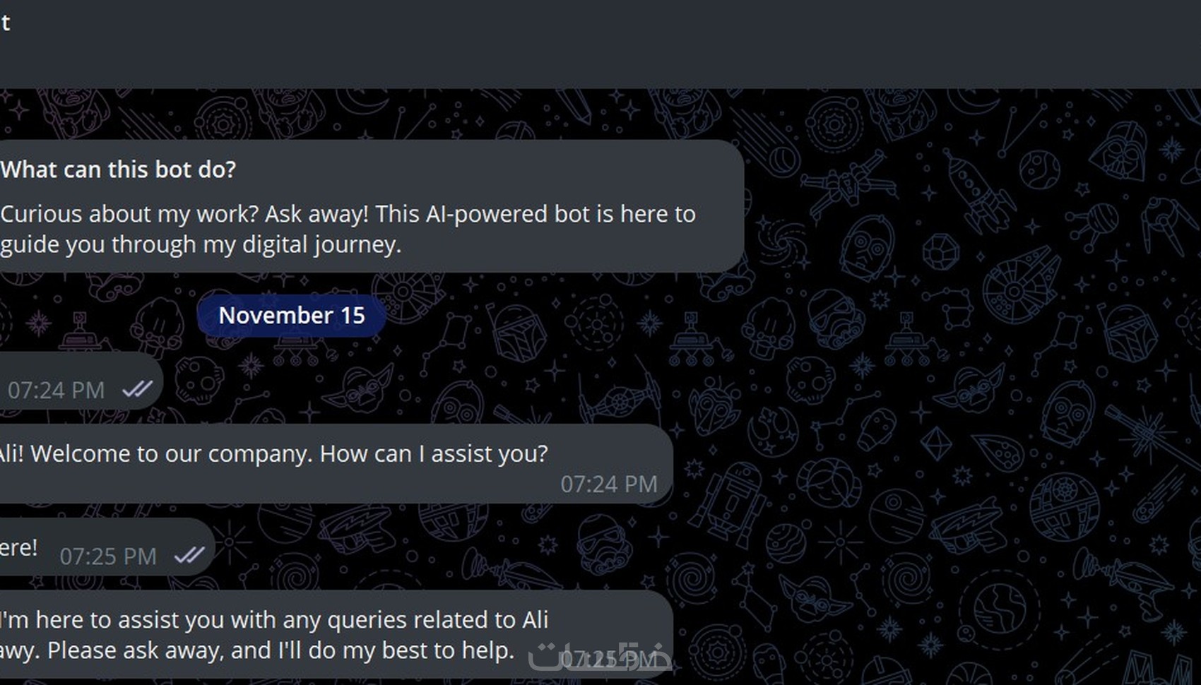 مساعدك الرقمي الشخصي على منصة تليجرام مع روبوت ذكي مخصص! سأقوم ببناء روبوت تليجرام يتفاعل مع مستخدميك، يجيب على أسئلتهم حول مشاريعك ومهاراتك، ويقدم لمحة شاملة عن أعمالك.